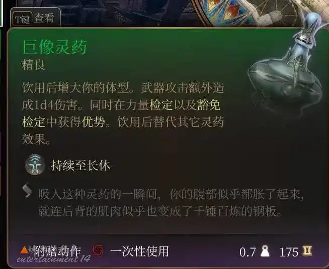 沒啥太需要注意的,投擲只會生效10回合不會持續到長休,別被描述騙了。榮譽上調了雲巨人的稀有度,嘰咕雞發的警覺貼子裡也講了8力力量藥不是無腦的最優選擇,建議四人隊最好不要攜帶兩個以上的力量藥人,要帶的話最好關注隊伍續航,續航再不好起床四處找九龍科技有點狼狽的。其他靈藥也是同理,均衡搭配。
