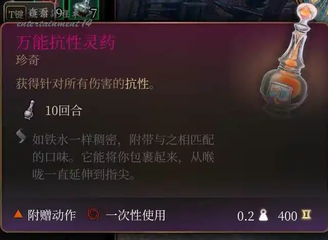 抗性靈藥還可以用來配合縱火狂之油施加火焰易傷,武器上塗縱火狂-對敵人施加火焰抗性-縱火狂抵消火焰抗性-去除敵人火焰抗性-敵人只保留10回合火焰易傷,其中的第二,第四步可以通過施加抗性靈藥來實現。
