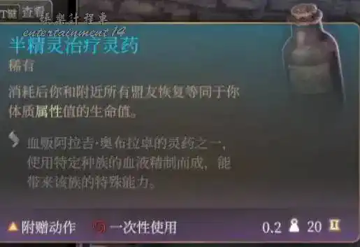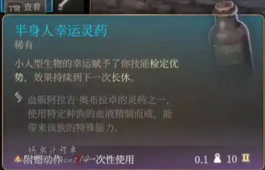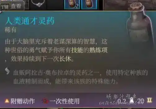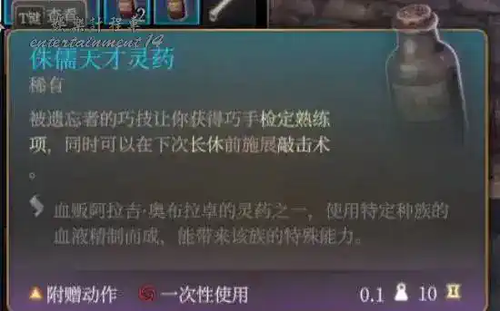第二章讓阿拉吉抽被蝌蚪寄生角色的血獲得,給一瓶對應種族的藥,持續到長休,人類,精靈,侏儒,矮人,半身人,龍裔抽的比較好用,其他的就算了。讓阿斯代倫過來還能拿一瓶永久力量+2的藥。沒貼的龍裔靈藥效果是威嚇遊說優勢和對應龍族亞種的傷害抗性和吐息。這種靈藥和雲巨人這類靈藥不衝突。需要注意的是使用這種靈藥後長休起床會帶一個所有擲骰-1的debuff。