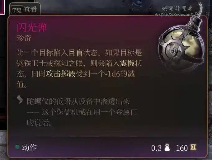 投擲道具,讓目標陷入目盲,如果是鋼鐵守衛還會被震懾,在後續攻擊擲骰承受1d6 減值,不會打鋼鐵衛士可以用這個,也能直接中斷鋼鐵衛士泰坦的回血。第二章烏爾布倫和巴克斯沒有死,在利文頓的郵局往前走的山洞裡找到裡邊的鐵匠購買,一次賣4個。飛龍關要塞樓頂巴爾信徒屍體上也有。鐵手侏儒山洞除了對話獲得的一個符文火藥炸彈,還有兩個符文火藥桶可以拉煙偷。