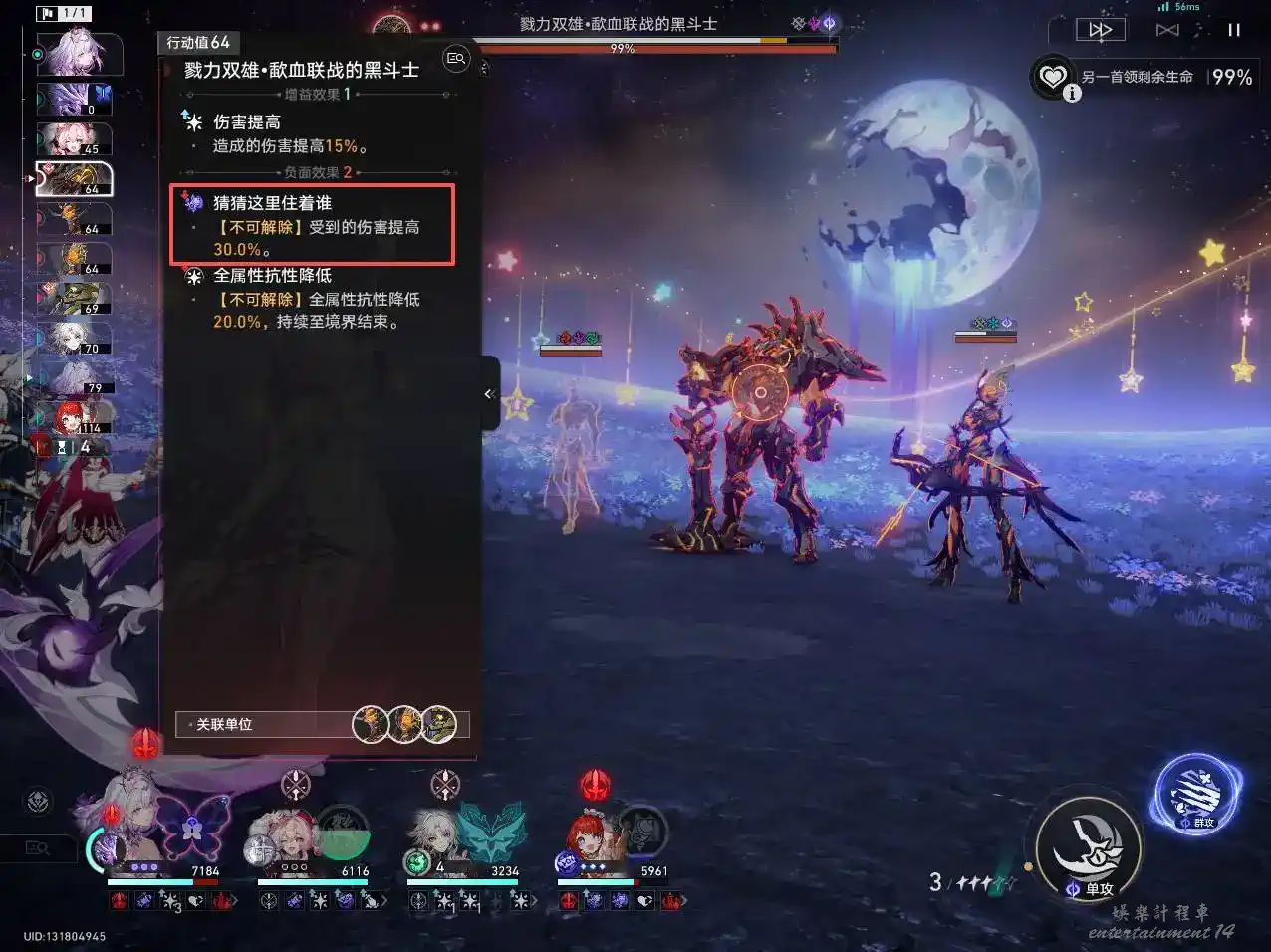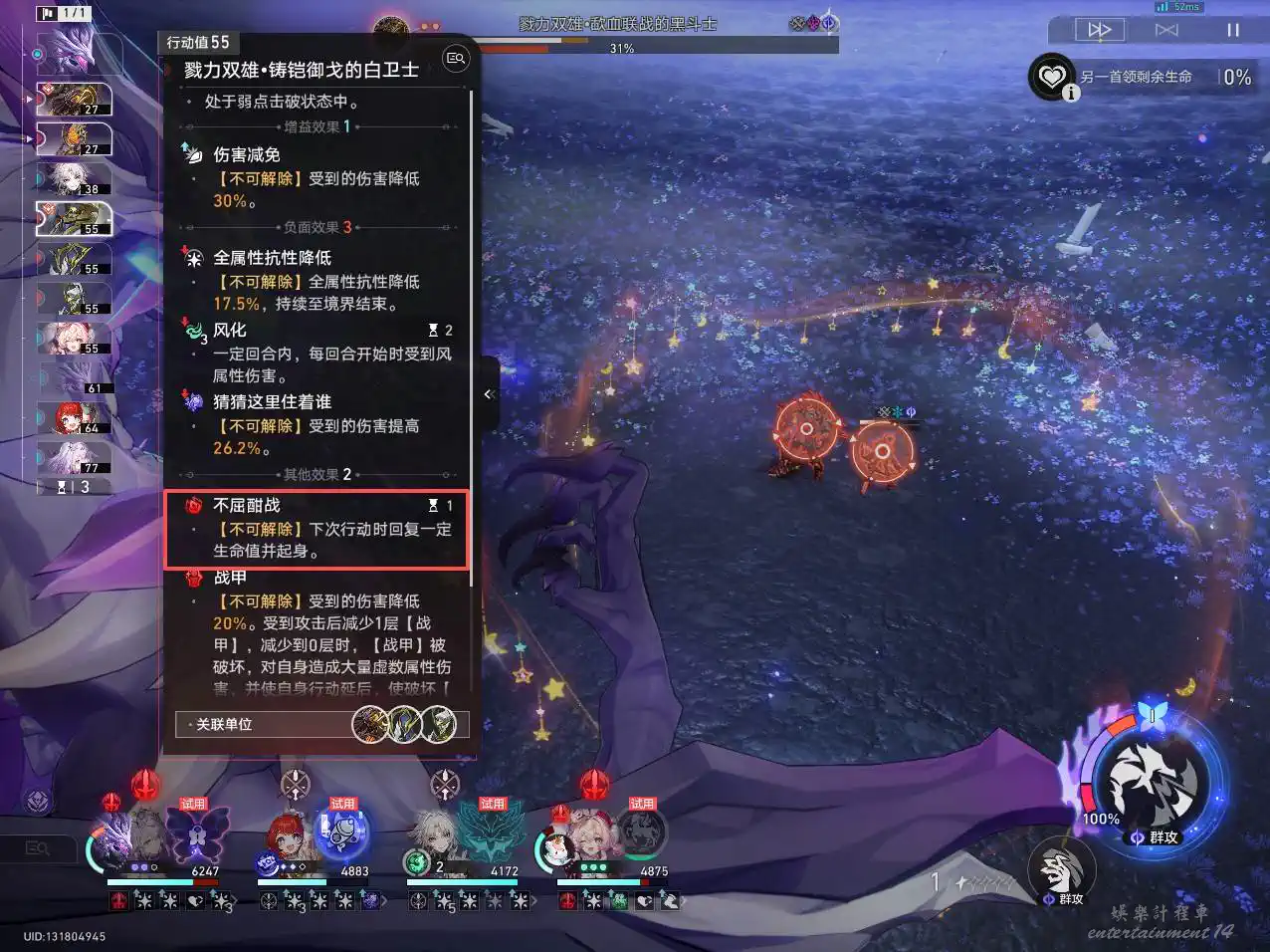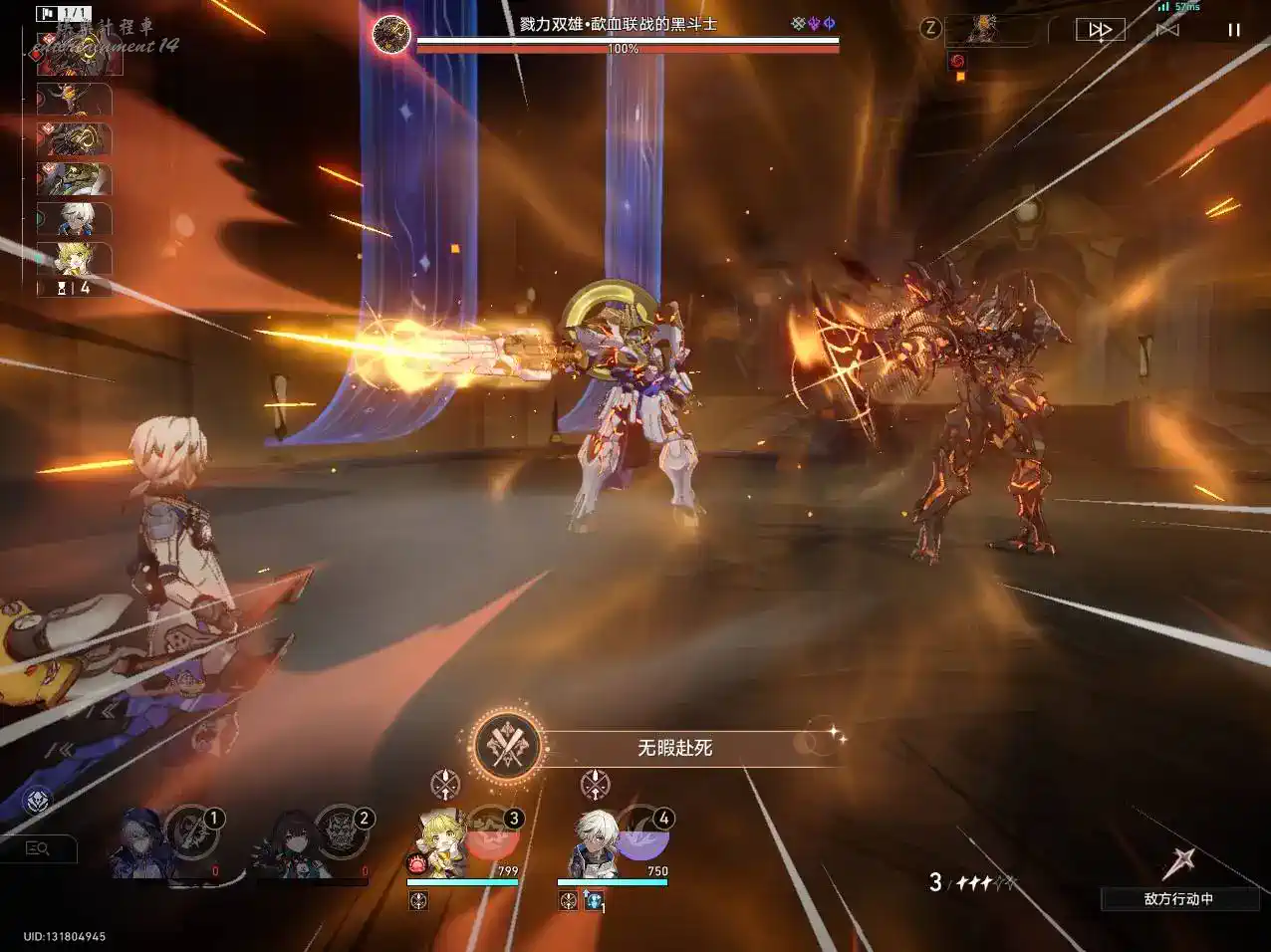[雙戰場]:我方全體目標將分別在兩個戰場進行作戰,不同戰場的我方和敵方目標無法攻擊到另一戰場的目標(治療效果和追擊效果可以正常觸發,戰技點共用)。