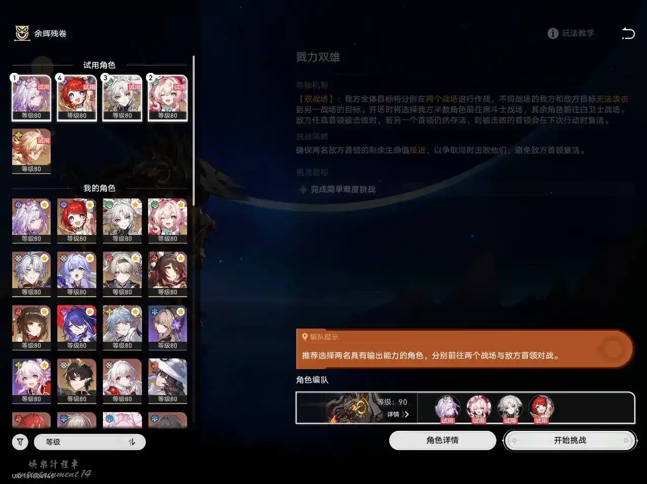 3.由於兩人成隊儘量攜帶有攻擊能力的生存位(風堇、靈砂、羅刹、騰荒、符玄、砂金)