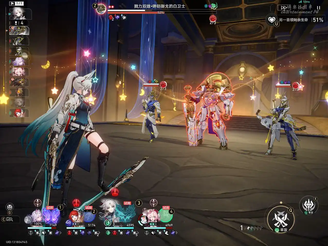 博主自己通關是用的:【瑕蝶+風堇】應對白衛士、【archer+花火】應對黑鬥士