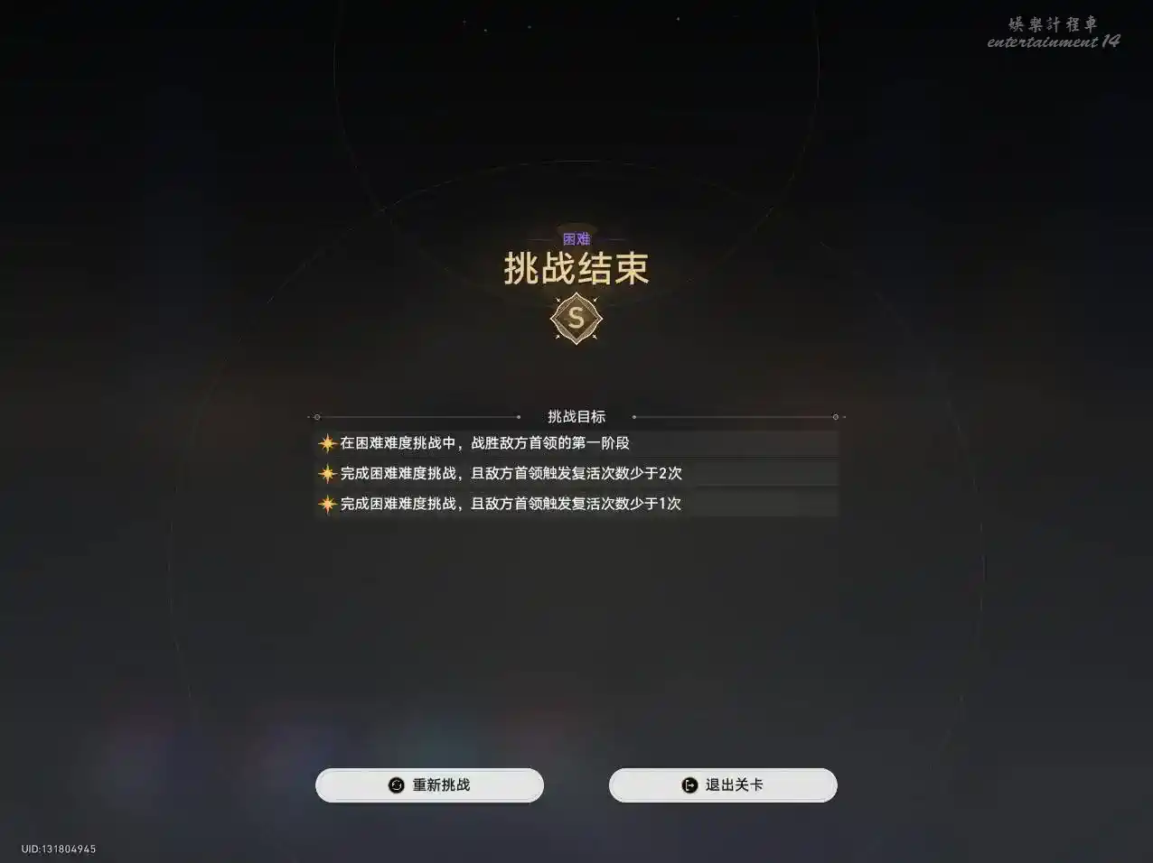 3星:完成困難難度挑戰,且敵方首領觸發復活次數少於1次(也就是BOSS不能復活)