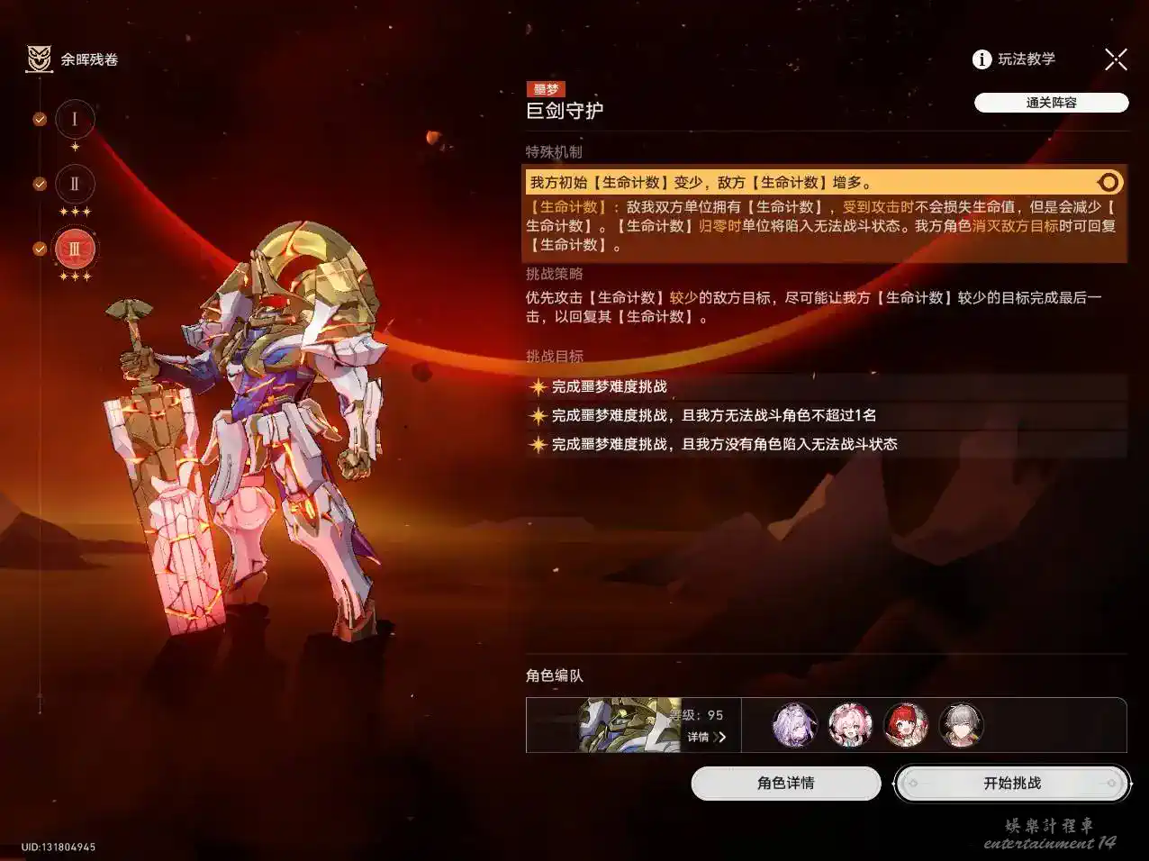 3星:完成噩夢難度挑戰,且我方沒有角色陷入無法戰鬥狀態