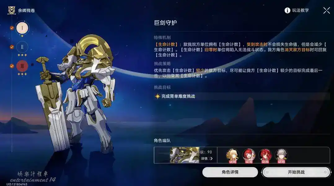 3星:完成困難難度挑戰,且我方全體角色[生命計數]均不少於10