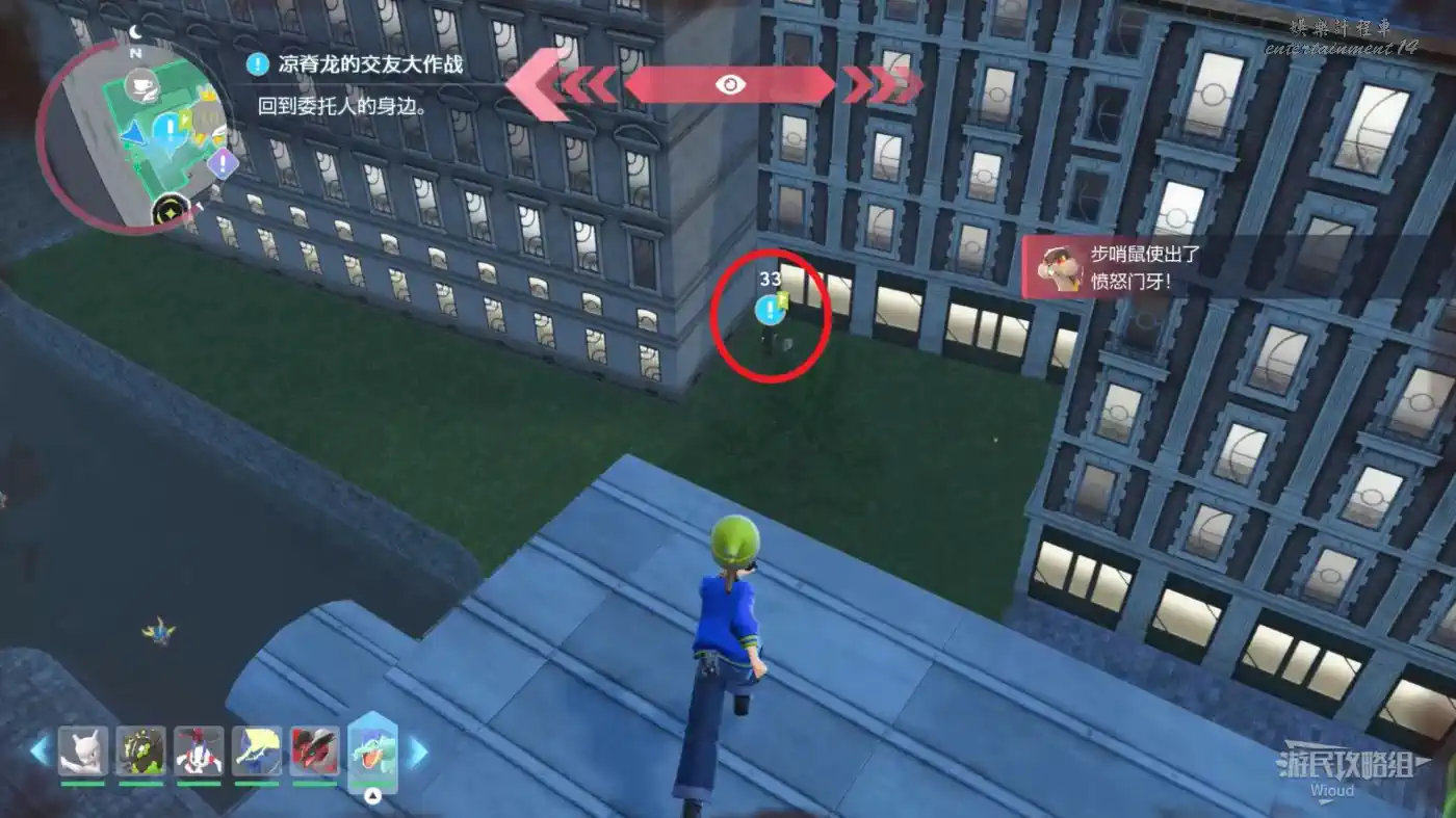 和他對話後,從屋頂邊緣直接跳到任務發佈人的位置,和她對話觸發劇情,完成此任務。