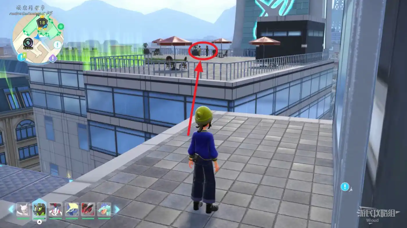 傳送到【18號野生特區】的門口,爬下圖角色圖示處的腳手架到屋頂,也就是18號特區屋頂入口處。