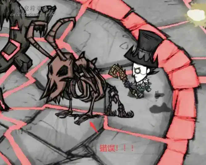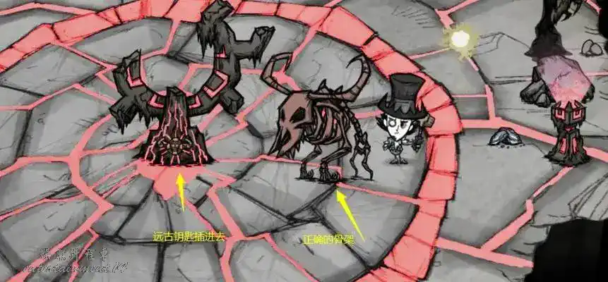 靠近大門將擊殺遠古犀牛掉的遠古鑰匙插入遠古大門,然後用化石碎片在靠近遠古大門的地方建立起暗影織影者的骨架(建造出來的骨架有兩種形態,其中一種是錯誤的召喚不出來,只需要用錘子砸了重新建造即可,錯誤如下圖
