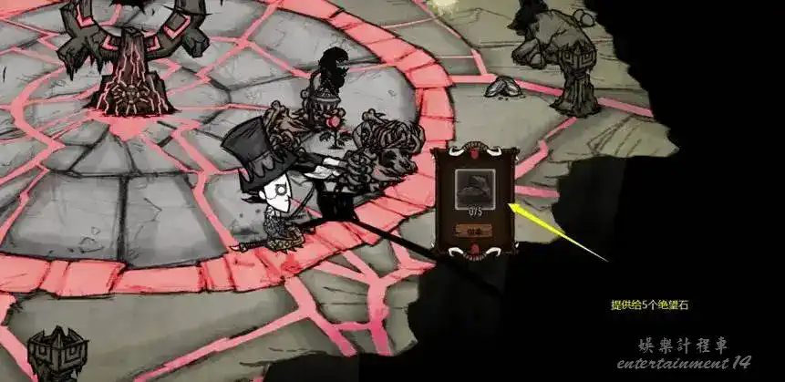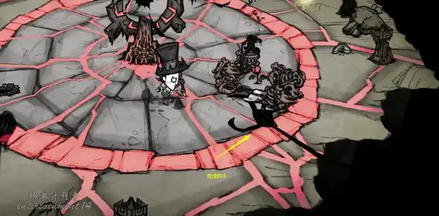 這是一個長期活,運氣不好的話你得探完整個地洞的地圖,殺完所有大觸手才能找到入口(有種例外,當你沿著地形邊緣探圖時,有幾率看到小島邊緣,那麼你就可以做一個瞬移法杖直接瞬移過去,不用費力尋找大觸手了,看到靠邊探圖的好處沒!!)去到小島後,小島是一個類似遠古迷宮一樣的小迷宮,走到盡頭便可以看見遠古大門!召喚所需材料