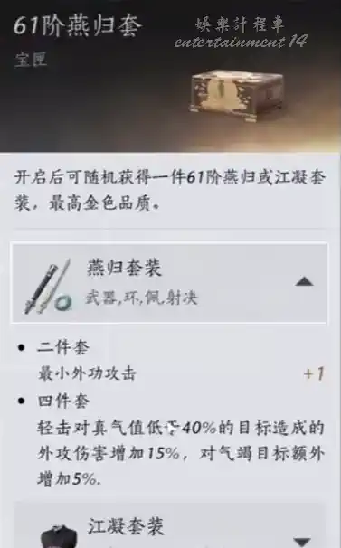 裝備也是提升精元上限的一個途徑。比如歸雁套裝,它的七件套湊齊後,可以增加5點精元上限。不過大多數裝備並沒有這個特性,所以如果你想在精元上限上有所突破,還是得靠一些特殊的道具或者心法。