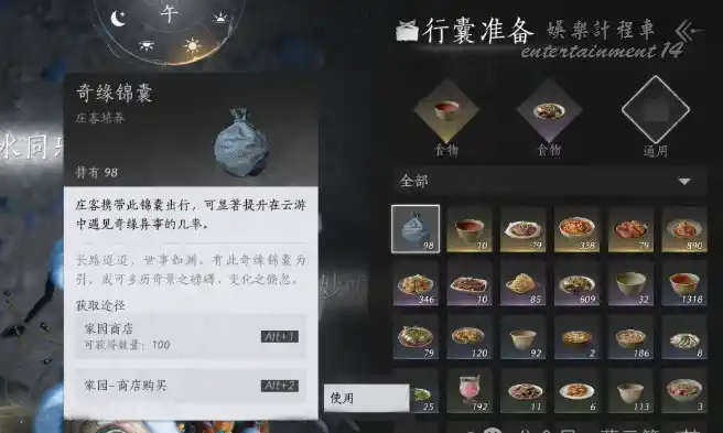 值得注意的是,目前只有金色莊客,並且手頭沒活兒的莊客可以進行探索。確定角色後,在行囊準備頁面,放入可用的食材,最好在最後一格中,再加入一個奇緣錦囊,增加奇遇觸發幾率(會有返圖)。