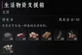 每週購買物資:草藥99個【青溪7920周元】+草藥99個【蕭遙9900周元】+草藥99個【蕭遠9900宋元】+草藥99個【倒懸壺9900宋元】+金鯉13個=【熊大6500周元】+蕈菇130個【視持有量判斷,不夠的去開不肝商店生活物資支援箱】