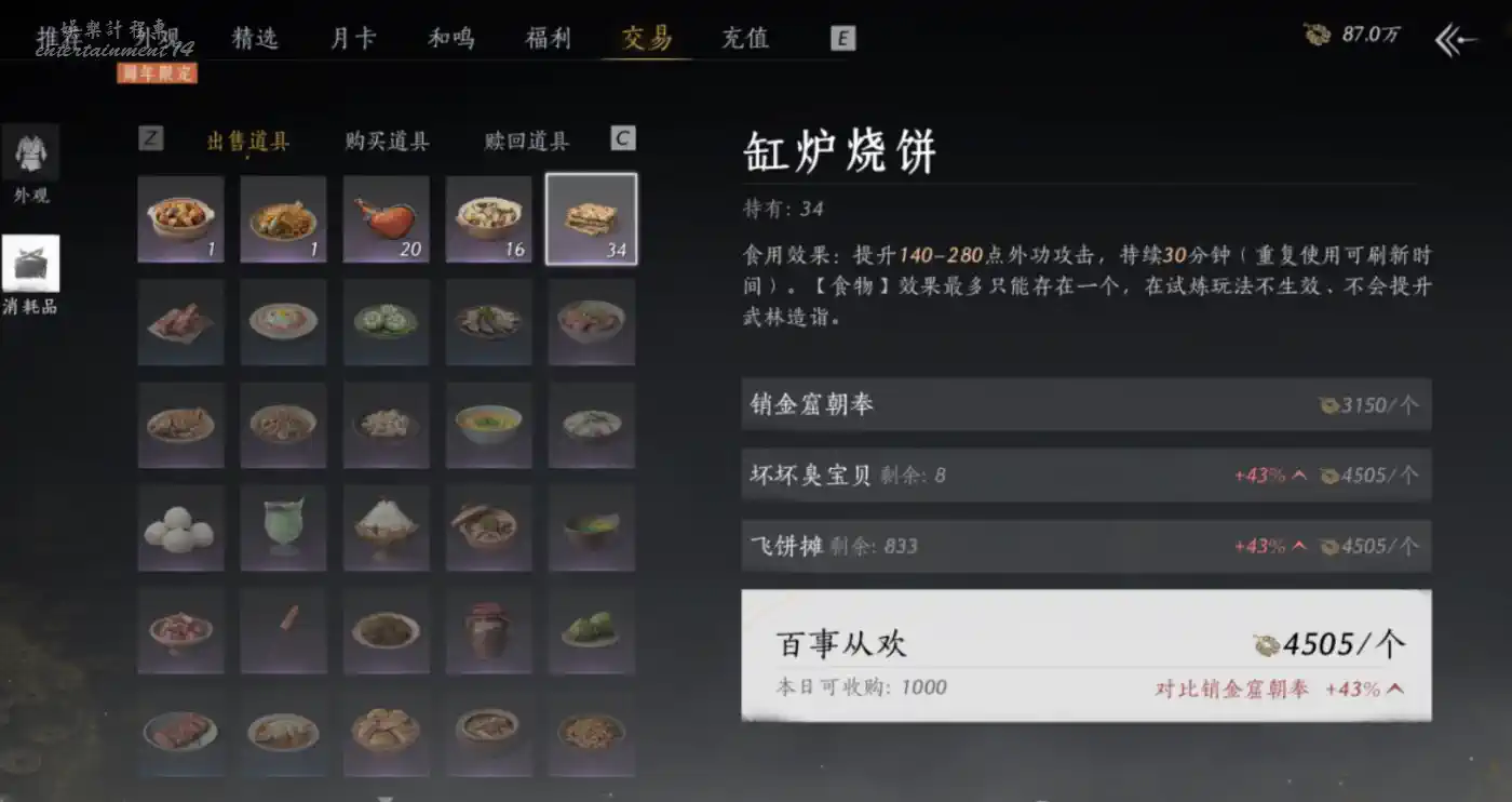 獲取足夠多的材料後,我們就可以來到百業商店去買燒餅了,一個最高要4505。每天刷滿,這比涮魚的價格要高很多,還是非常香的。