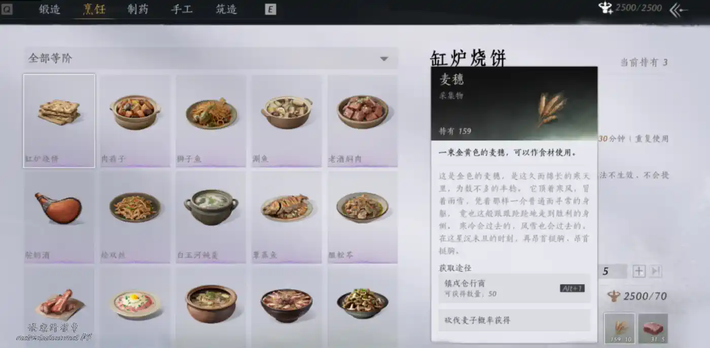 然後,打開製作頁面,找到該配方。一個缸爐燒餅需要2個麥穗以及1個野豬肉製作。那麼問題來了,野豬肉好說,在之前的天陘地區收集了不少,但是這個麥穗怎麼獲得?