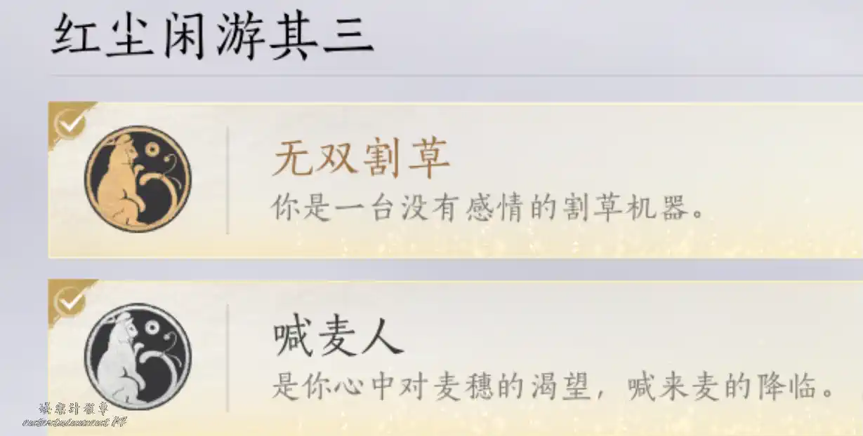 另外,收割麥子這邊的還有兩個成就,喊麥人(可通過獲得麥穗獲得),另外一個則是無雙割草(割取1000個麥子)。使用割草機後,這兩個成就可以快速達成哦。
