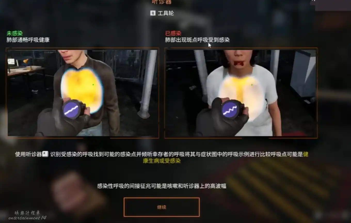 裝備聽診器後,能看到倖存者肺部對應的顯示介面和黑點,將滑鼠懸停在黑點上就能清晰聽到呼吸聲來精準判斷。