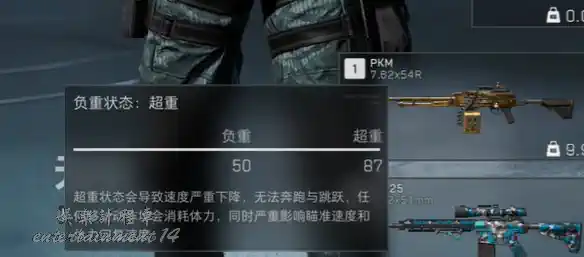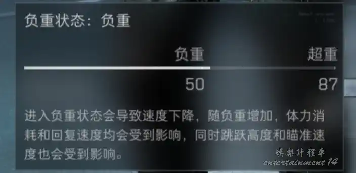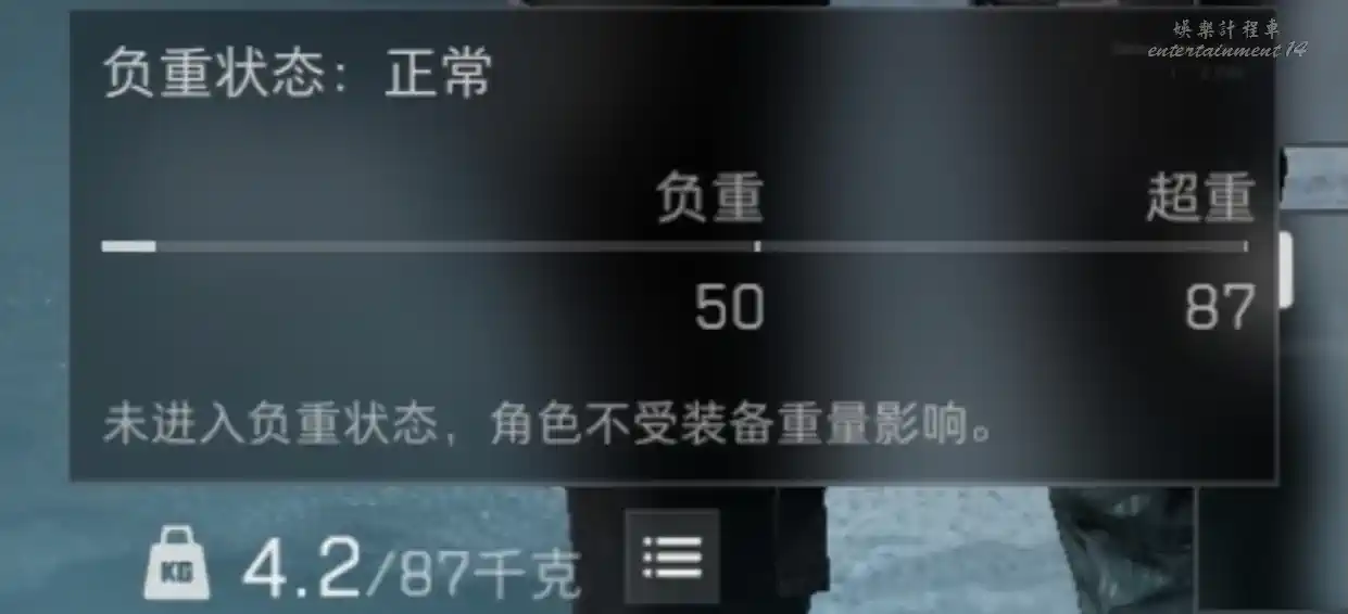 遊戲介面會即時顯示當前總重量/當前負重閾值/當前超重閾值的數值。