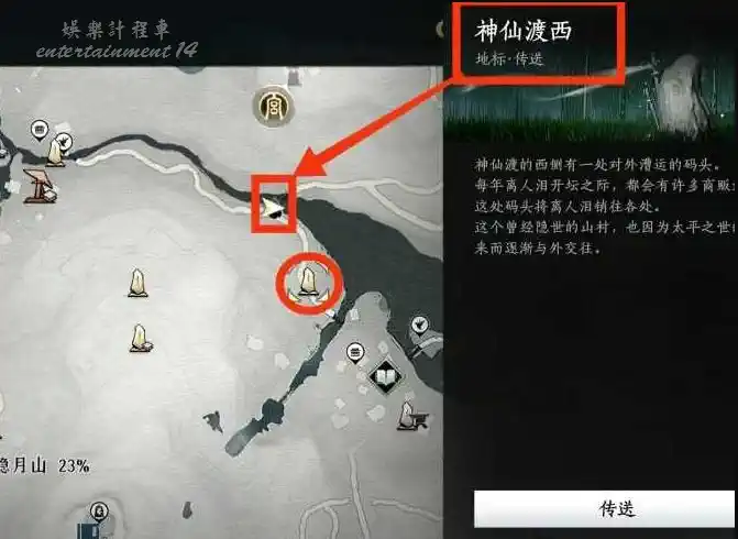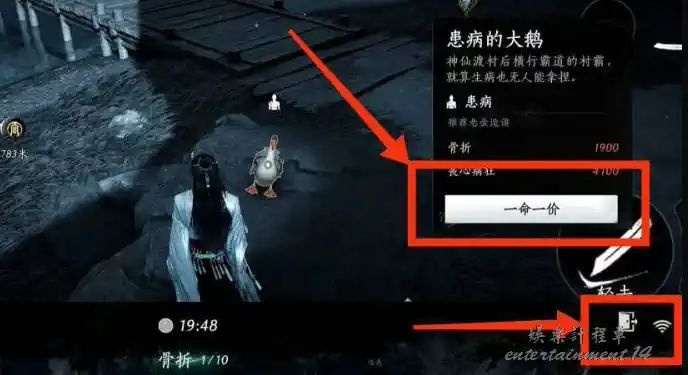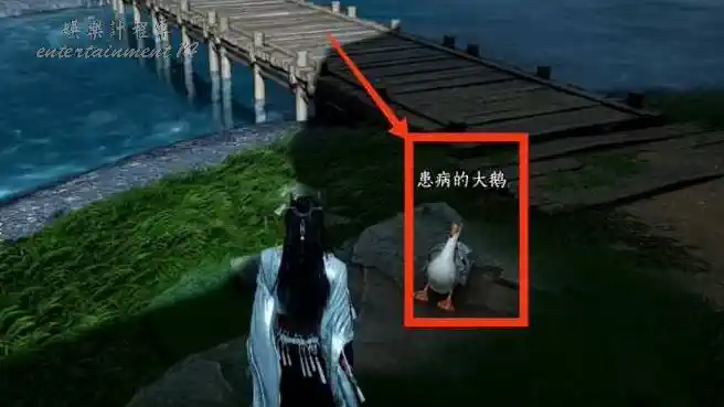 前往【神仙渡】地圖西側的紅框標註位置,在橋邊找到一隻生病的大鵝。