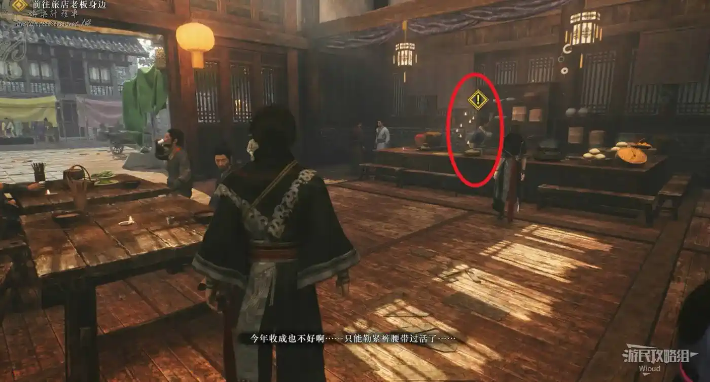 畫面一轉,主角在一個陌生旅店的大廳被朱和叫醒,和旅店掌櫃對話詢問三個問題,旅店掌櫃右邊就是武器店老闆。