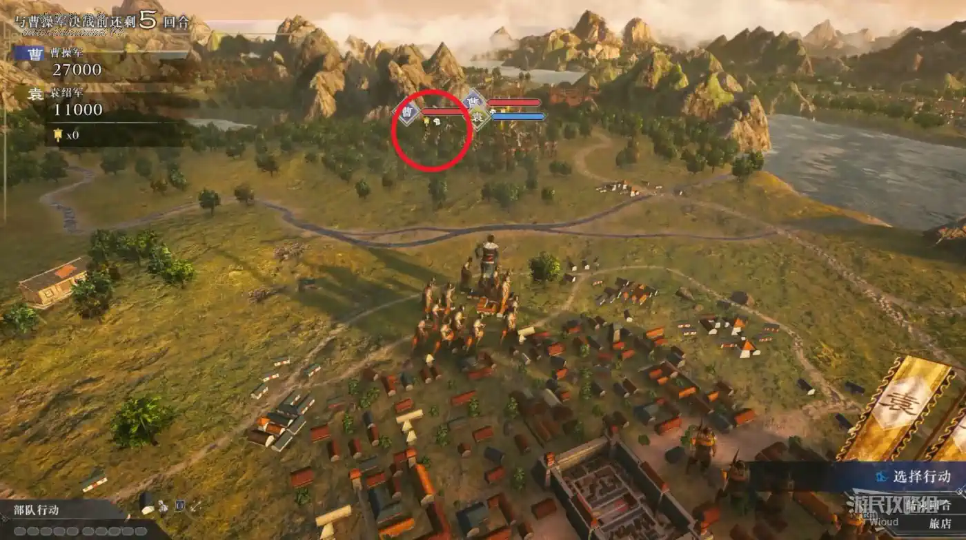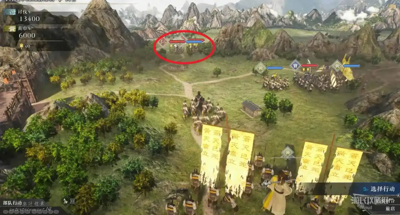 打完虎牢關會立刻進入軍略,先擊退左邊沒人管的孫家兵團,再用部隊行動消耗一次旁邊兵團的血量。