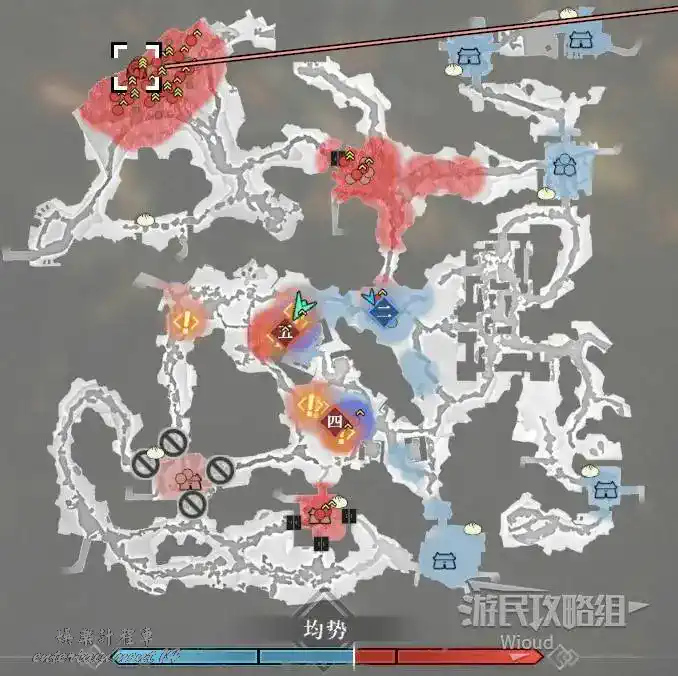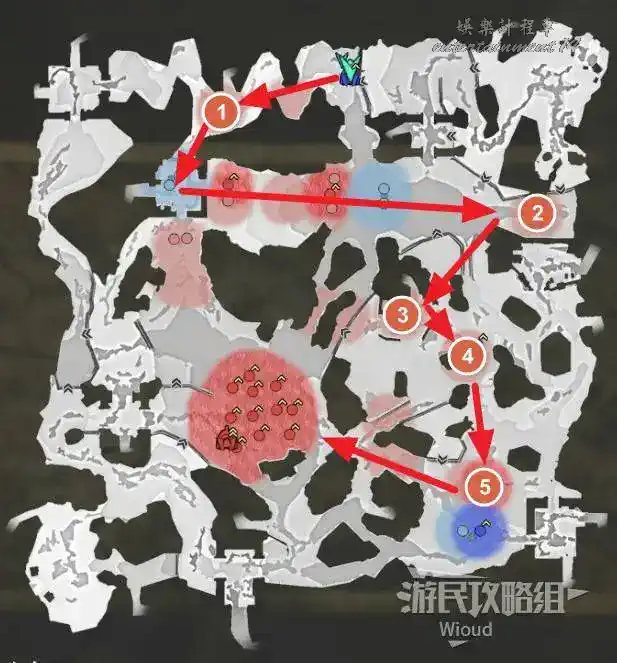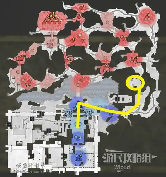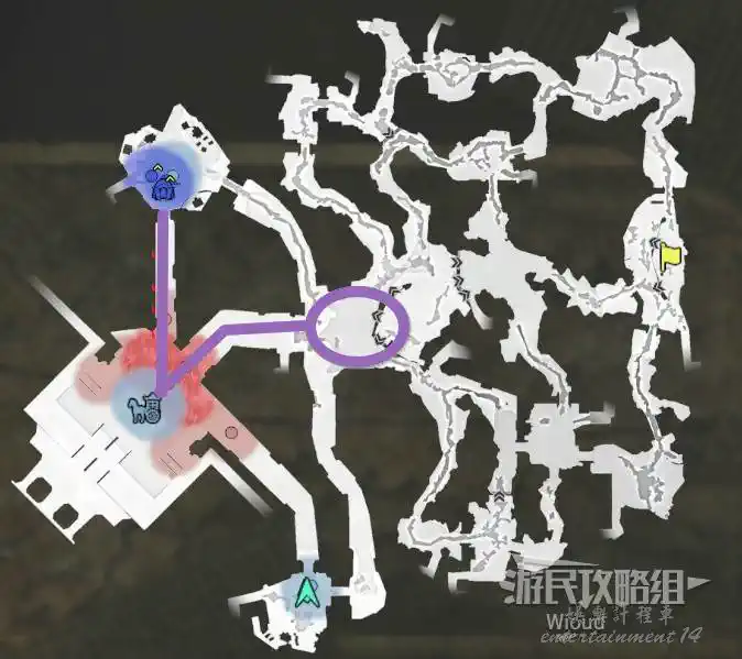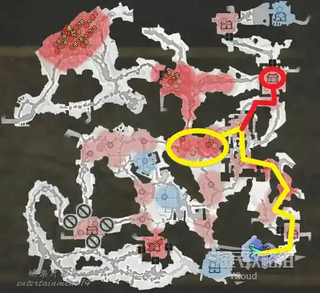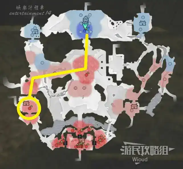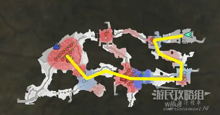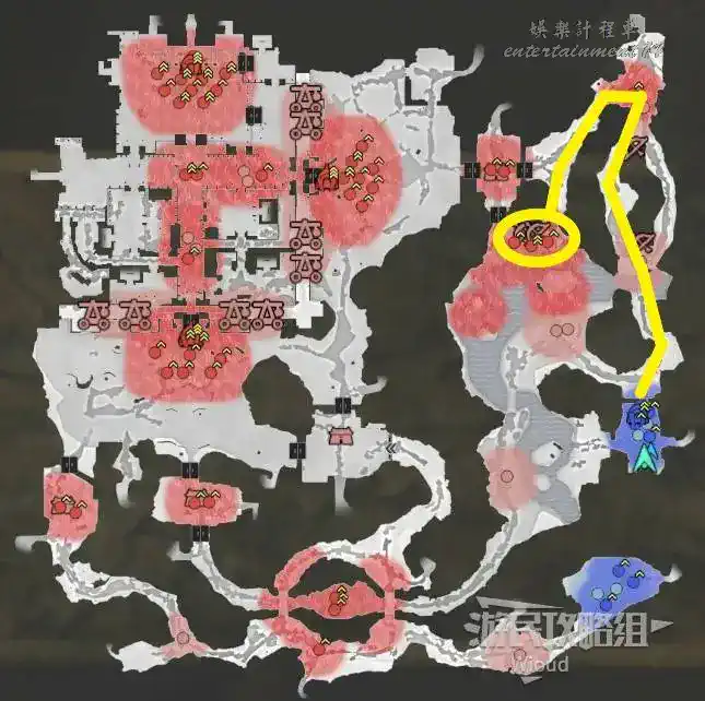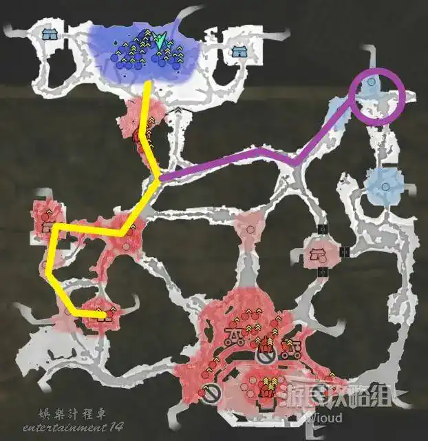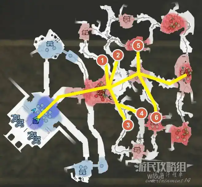 開局先跟著黃色路線把地圖左下角打穿,速度儘量快點。