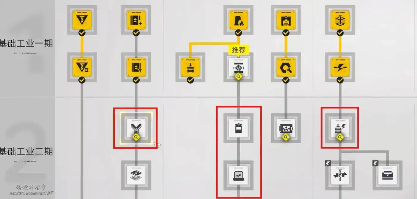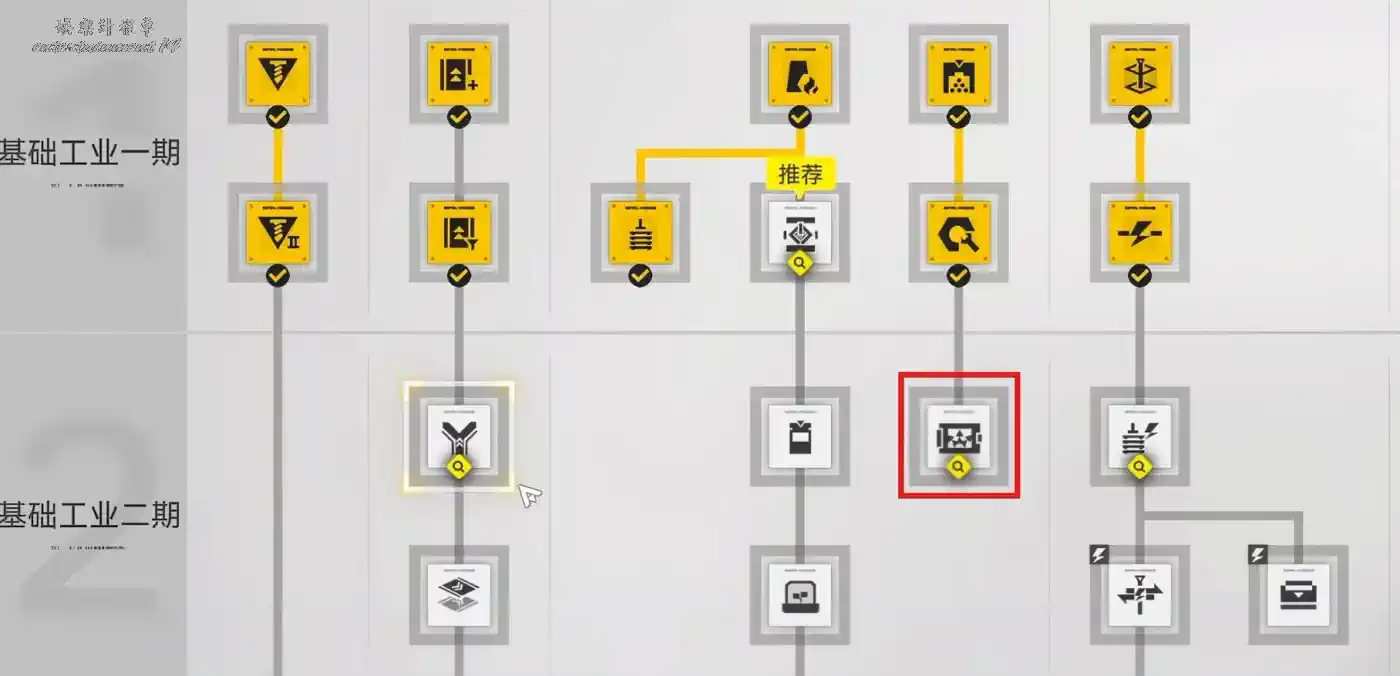 我們只需要順著新手教學點到二期工業,並且開了以下這幾個科技樹,就能做出A藍圖的設備。