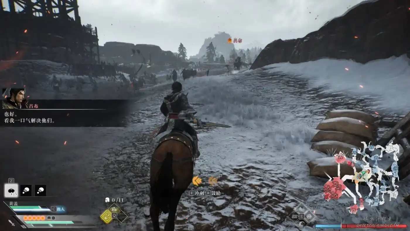 一開始呂布會在中間的位置一直騎馬不停地衝刺,注意躲避並在間隙積極攻擊。