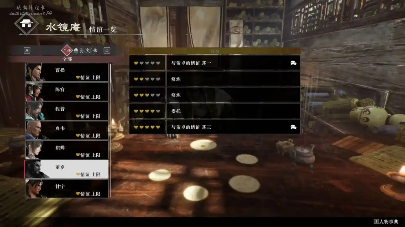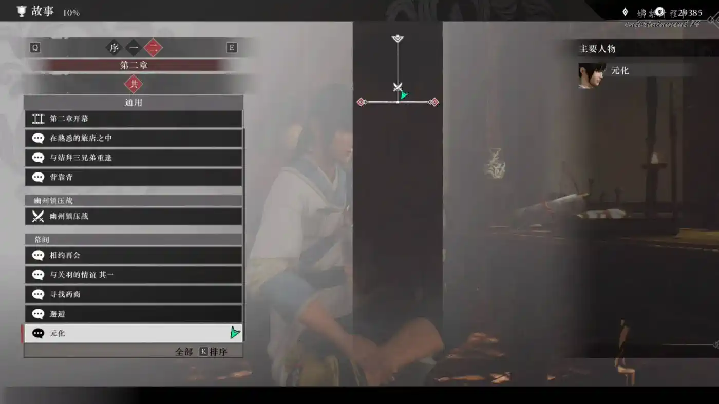 幽州鎮壓戰後,見到元化以後回到旅店就會解鎖故事和目錄,可以查看發生過的劇情,以及各種收集內容和武將的情誼等級。