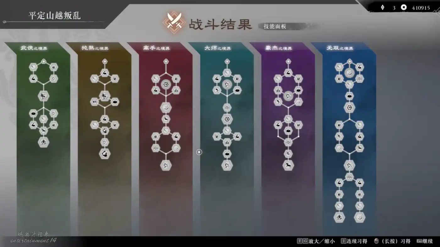 解鎖所有的技能面板要達到50級的境界等級,平均每個武器的熟練度要達到5級