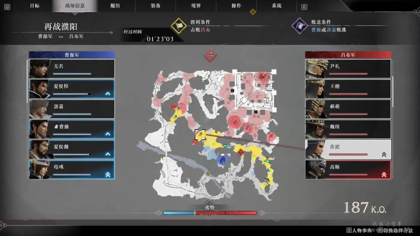 重複幾次落馬後,呂布就不騎馬了,此時盡力攻擊,等到主角輸出不足時,選擇換人切換到同行武將,首先儘快使用同行武將的所有武藝,等到鬥氣不足後馬上使用武神覺醒,然後繼續使用武藝攻擊呂布。
