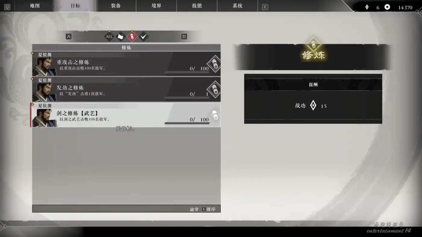 在暫停功能表的目標-修煉可以看到目前接受的所有修煉。