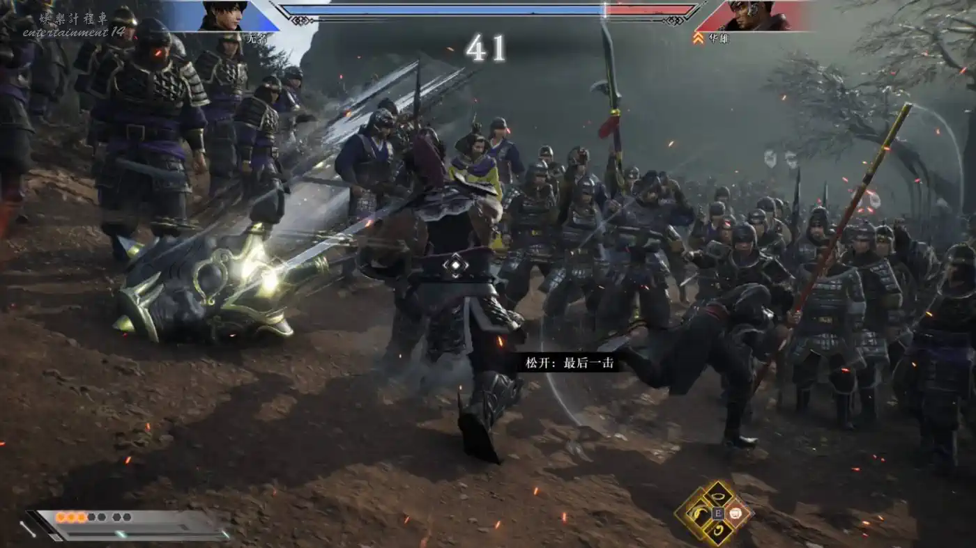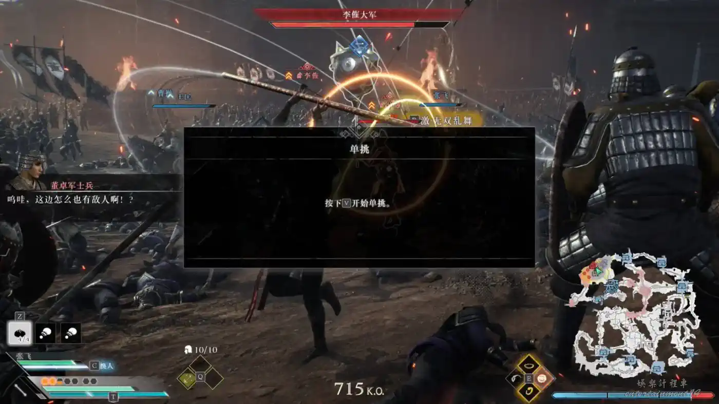 在汜水關之戰開始,部分的敵軍武將在地圖上會有兩把刀的圖案,代表這些武將在靠近的時候可以按V進行單挑。