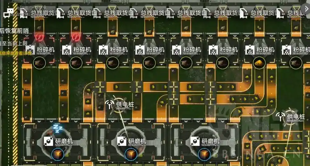 擺放產線的時候應先考慮主要機器的位置和原材料的走線(比如研磨機跟原材料機器的二對一關係),然後考慮砂葉的走線,最後再考慮電線杆的位置。電線杆的供電範圍在匯流排-精煉-粉碎集群中緊貼粉碎輸出口放置可以極限給精煉供上電。