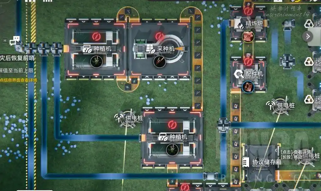 首先第一件事是去1號據點擺四個電廠(有分流器的話),滿足基地擴張I的解鎖需求。然後在據點1裡做一條藍藥(紫甁)生產線,確保能交上據點的任務。如果自己也要吃就再拉一條,據點沒地方了就一會回家在基地旁邊拉。為了之後大批量製造種植機方便,這裡最好找個地方再來一個紅花產線專門拿去燒炭,之後需要用這塊地的時候直接拆了就行,應該爆倉了。