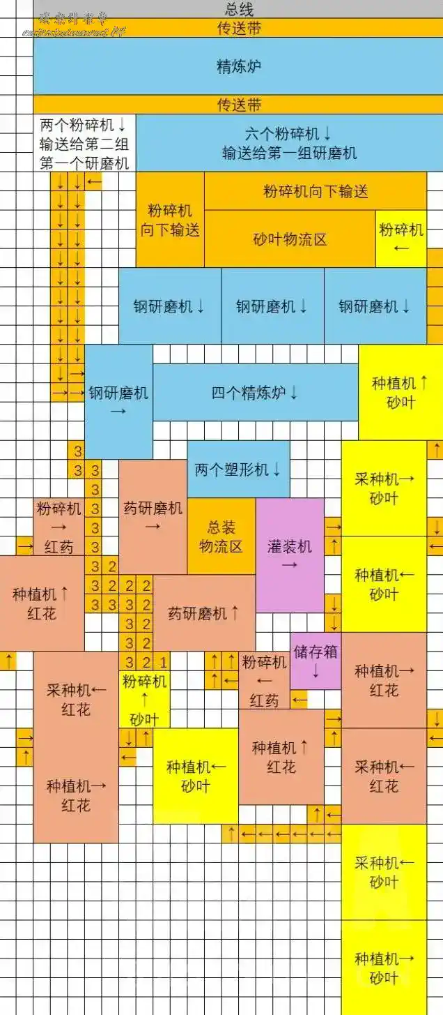 由於紫藥產線需要面積太大且材料混亂,我自己都是見縫插針擺的(而且之後還要重建),這裡暫時只給出一些優化建議:
