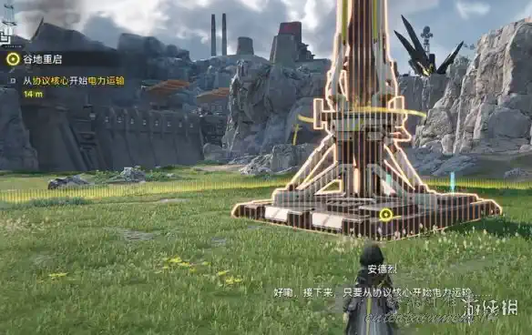 最終連接:從第三個中繼器拖拽電纜至協議共振塔(高大塔樓狀建築)→完成電力傳輸