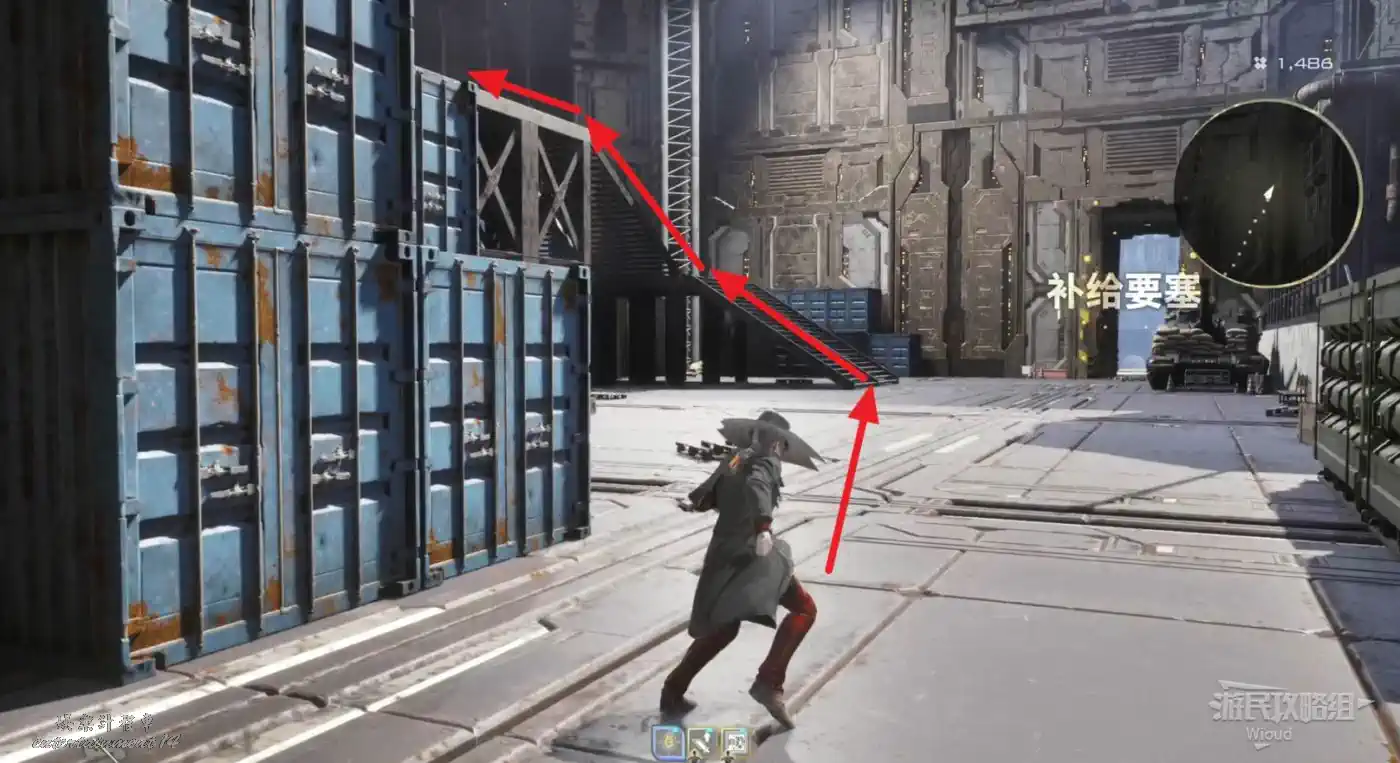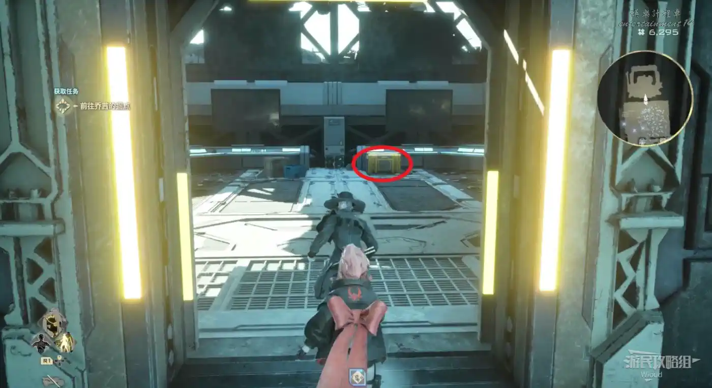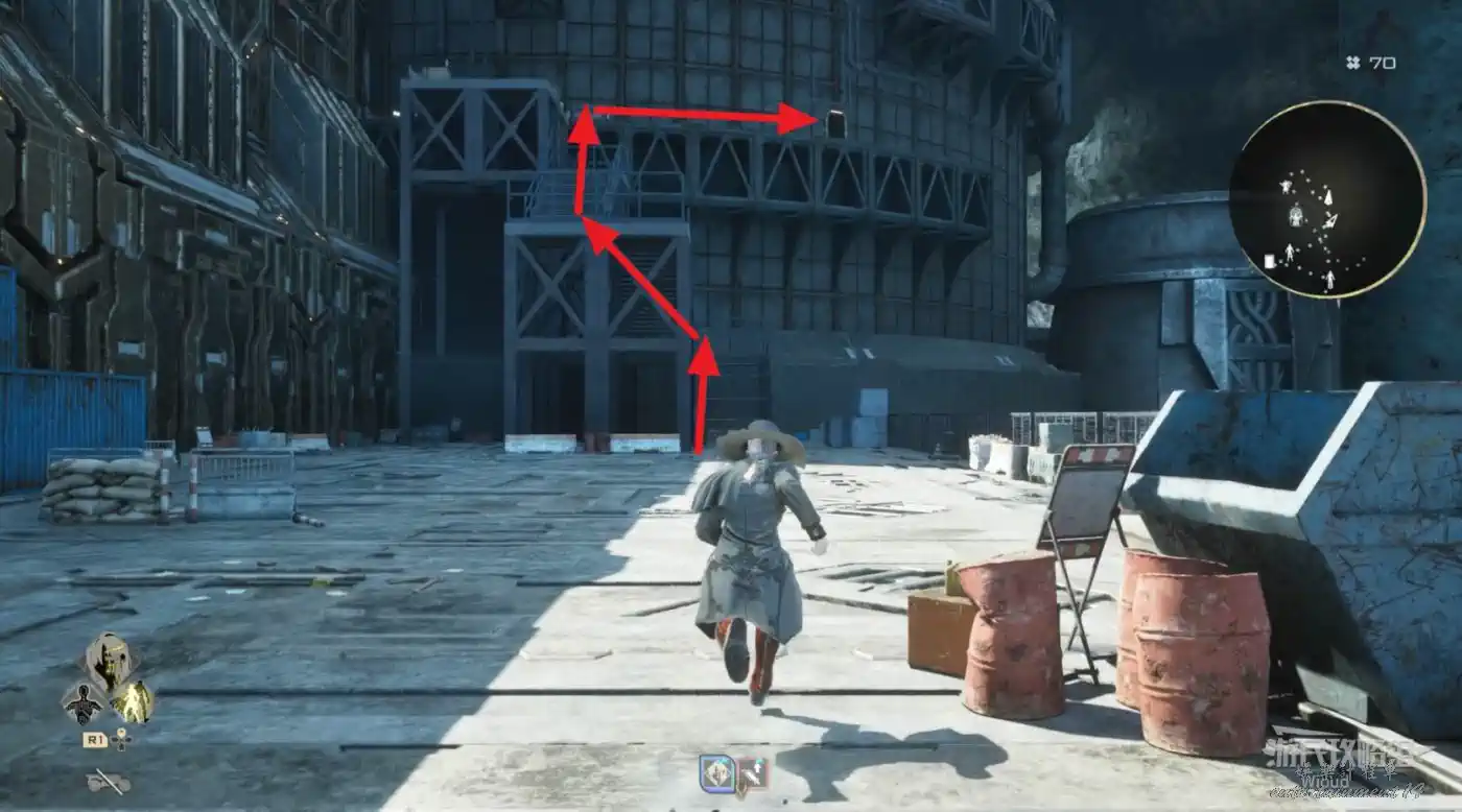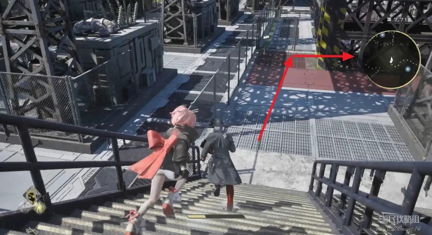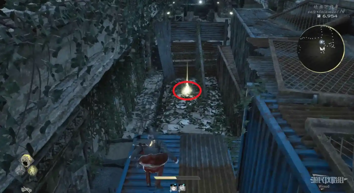 沿著上述的路徑移動到“喬茜的據點”,繞到建築左邊走到頭,乘坐天梯到建築下方。
