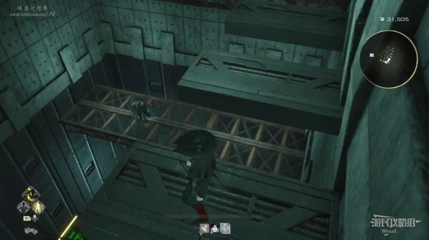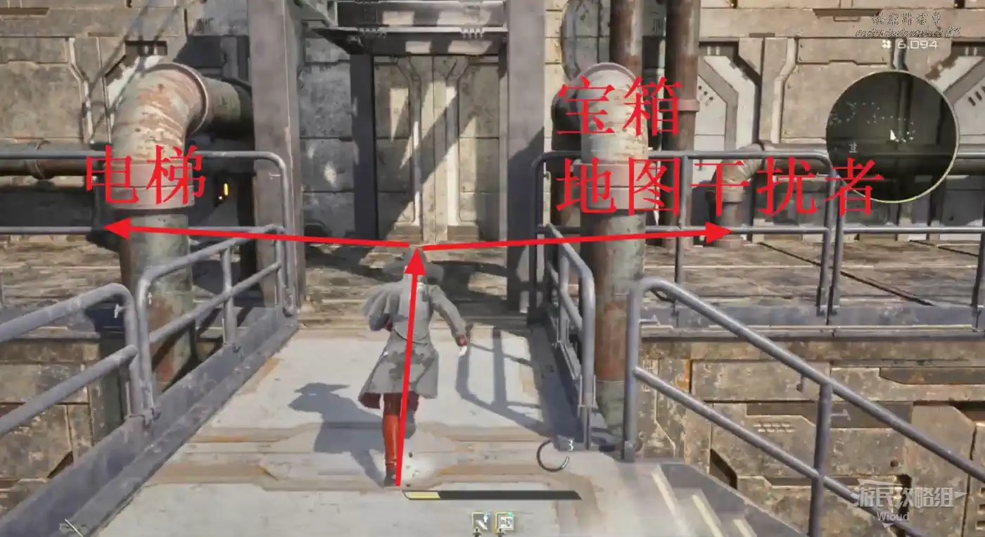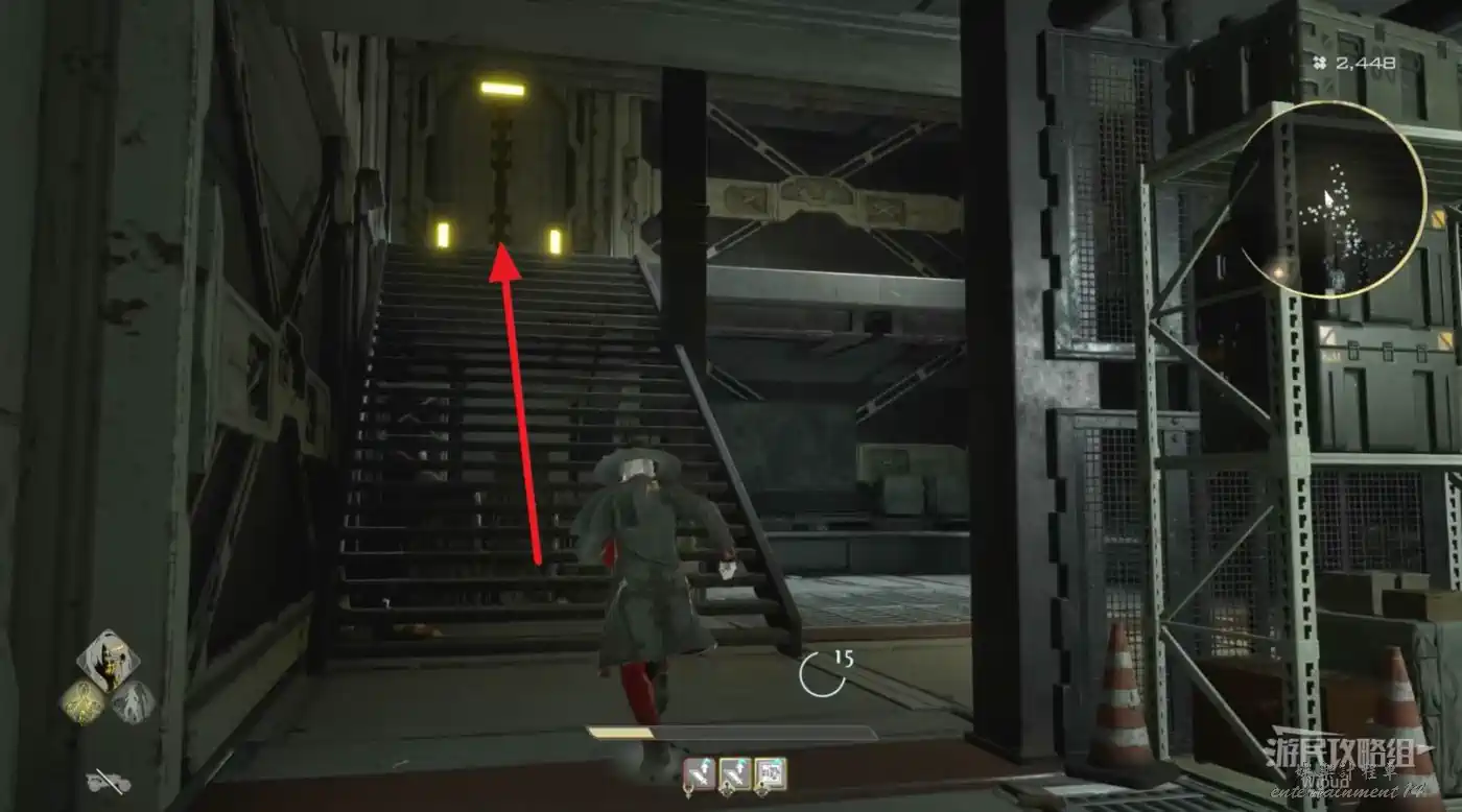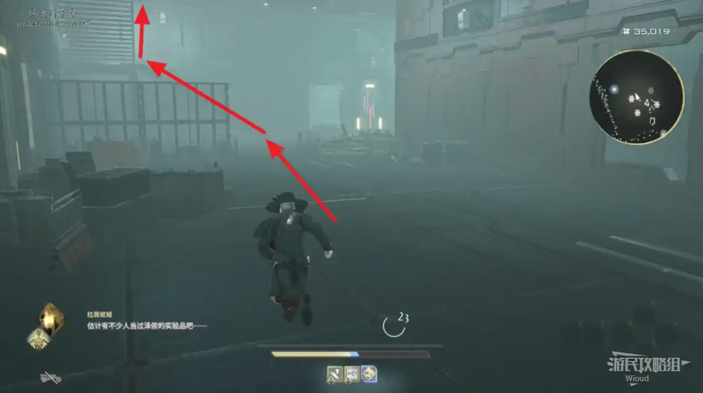 沿著上述的路徑移動到“喬茜的據點”,繞到建築左邊走到頭,乘坐天梯到建築下方。