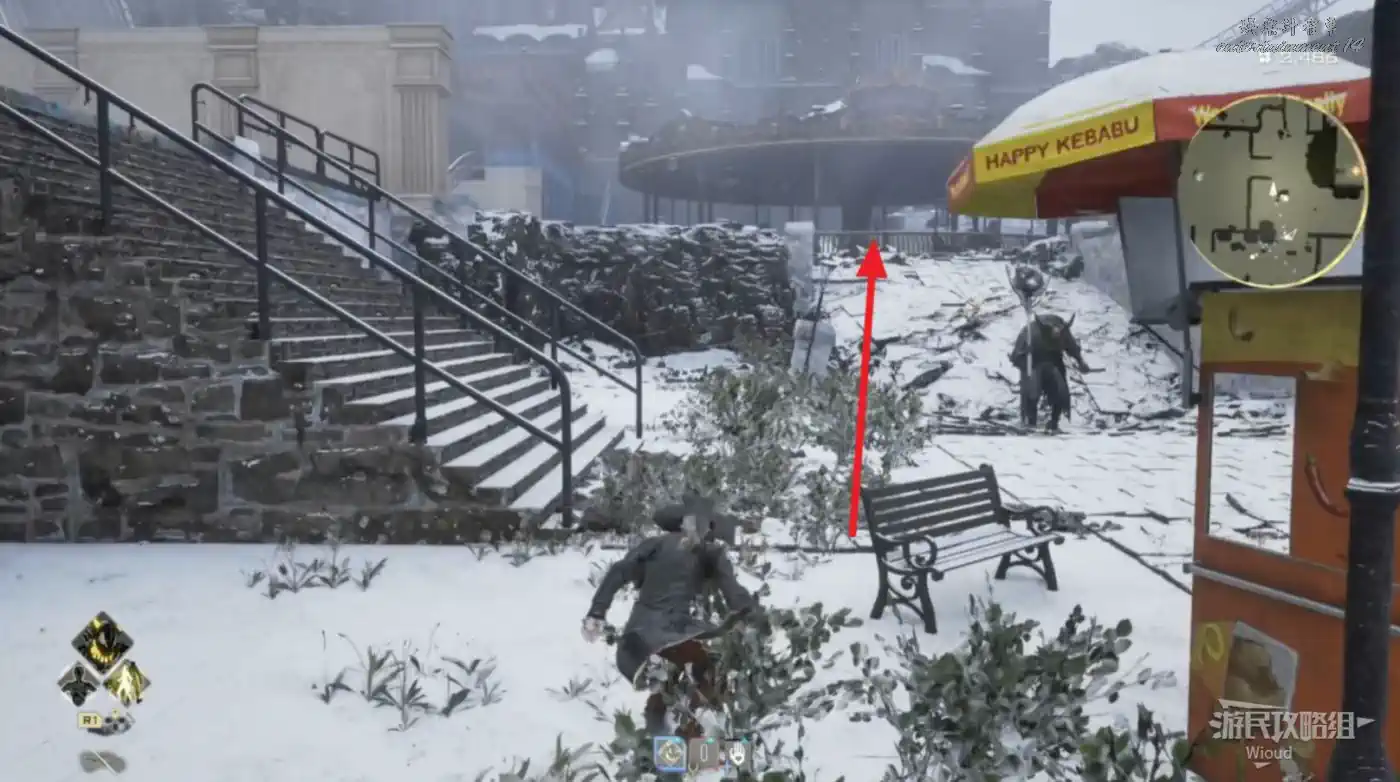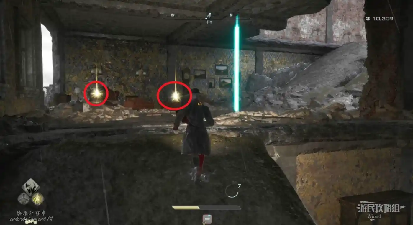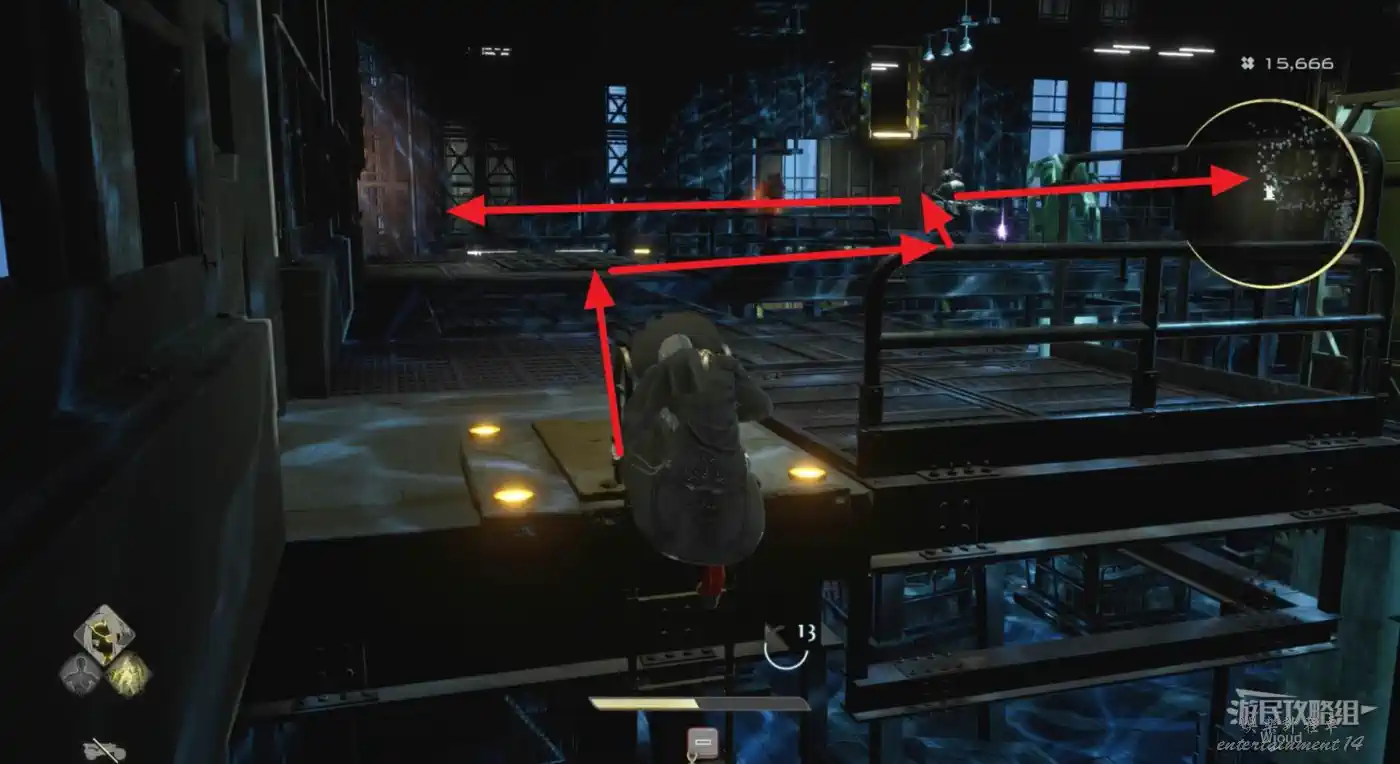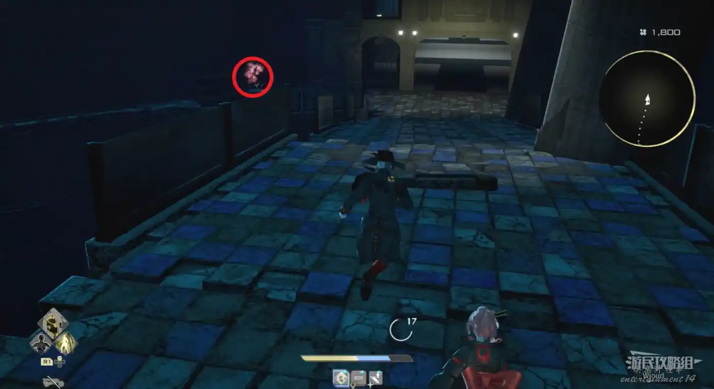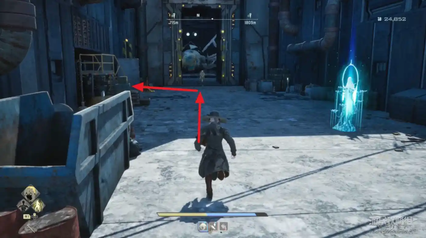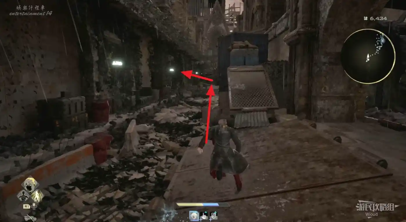 啟動復活點,穿過一片廢墟,看到頂部天花板有個紫色道具時,右側街道沿著上坡到天花板直接拿。
