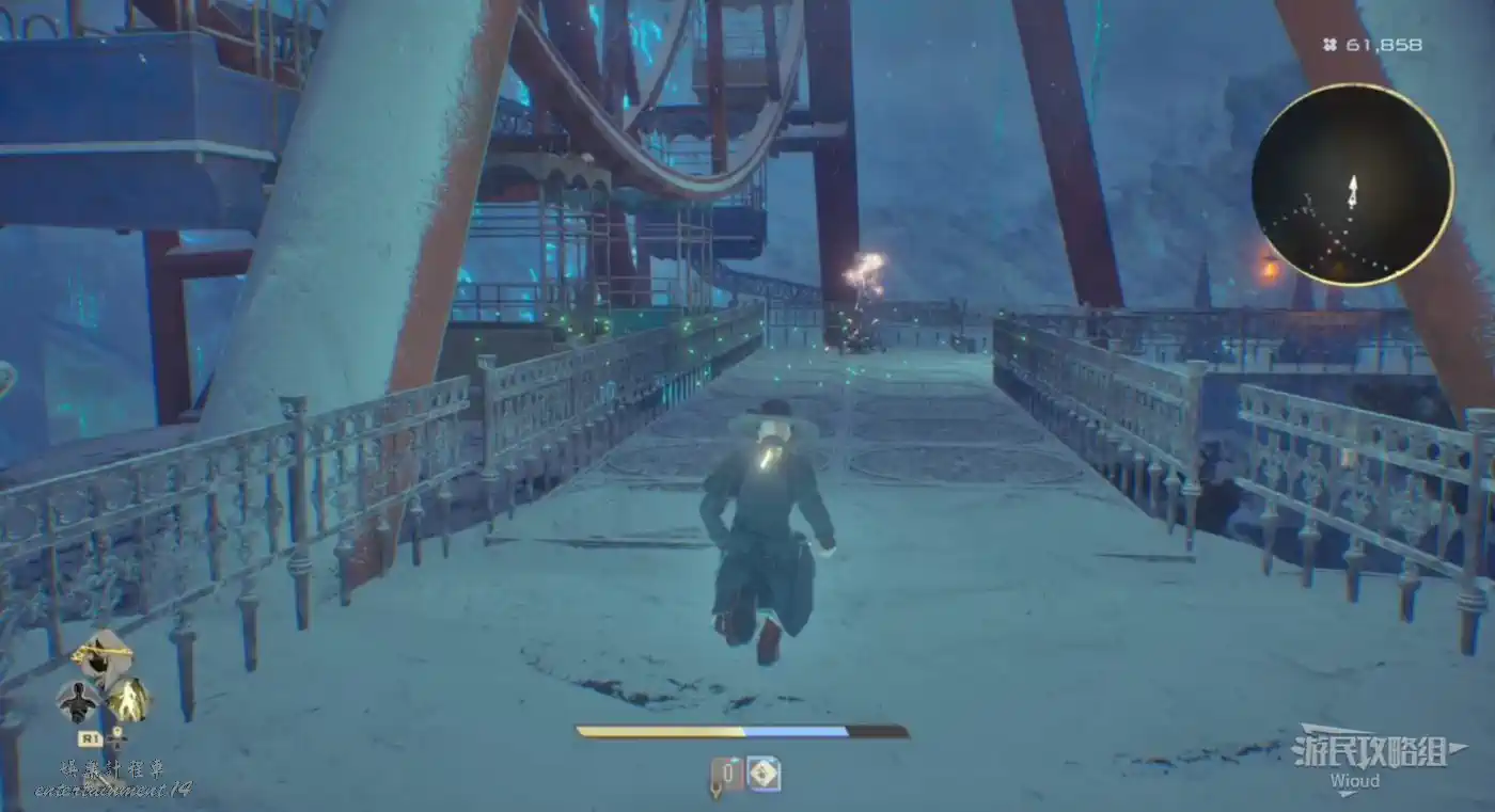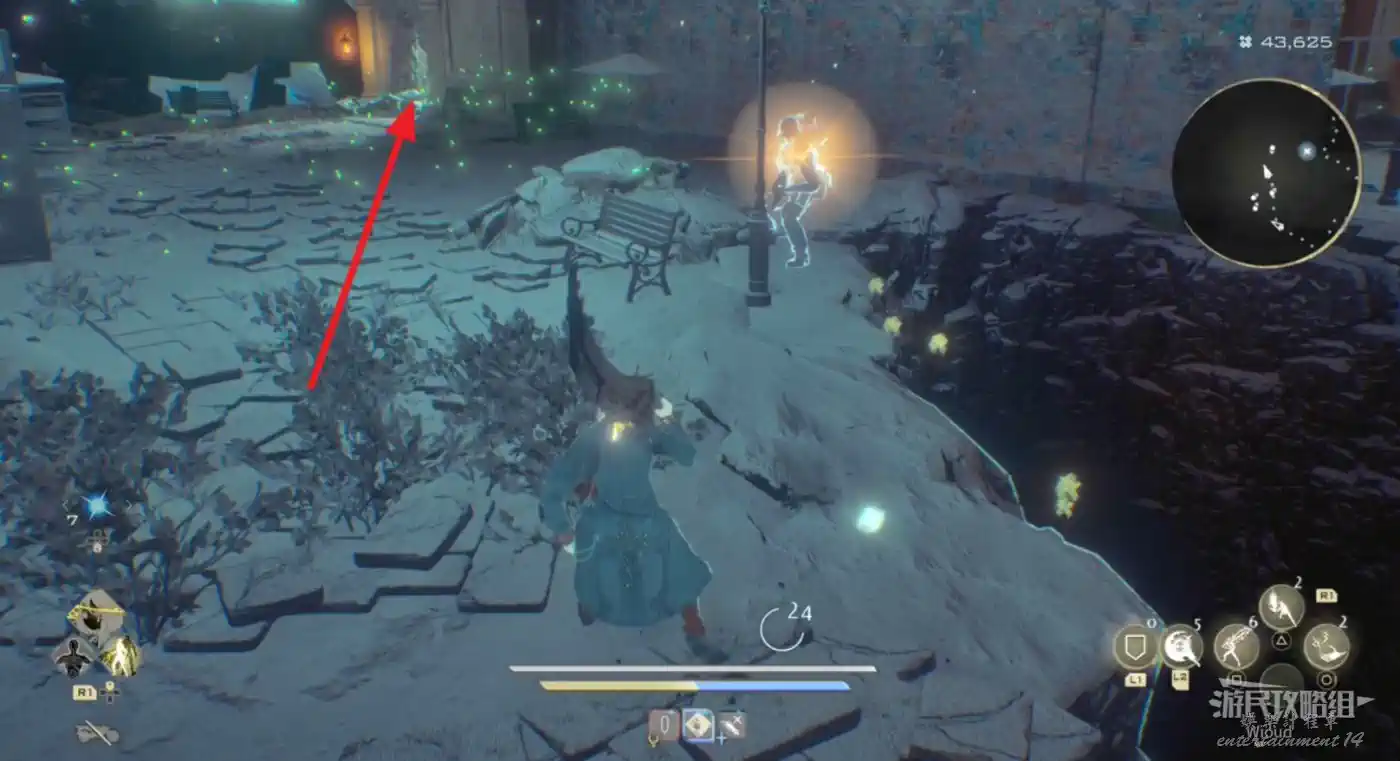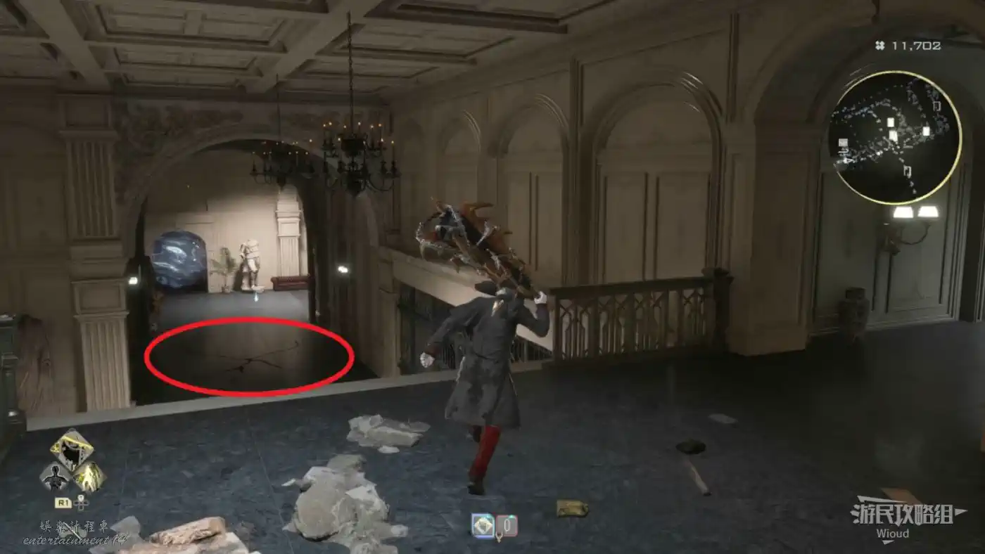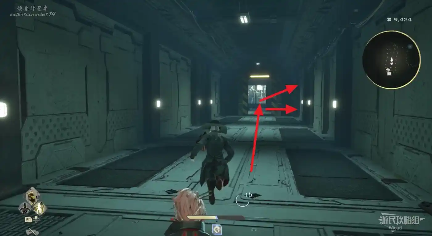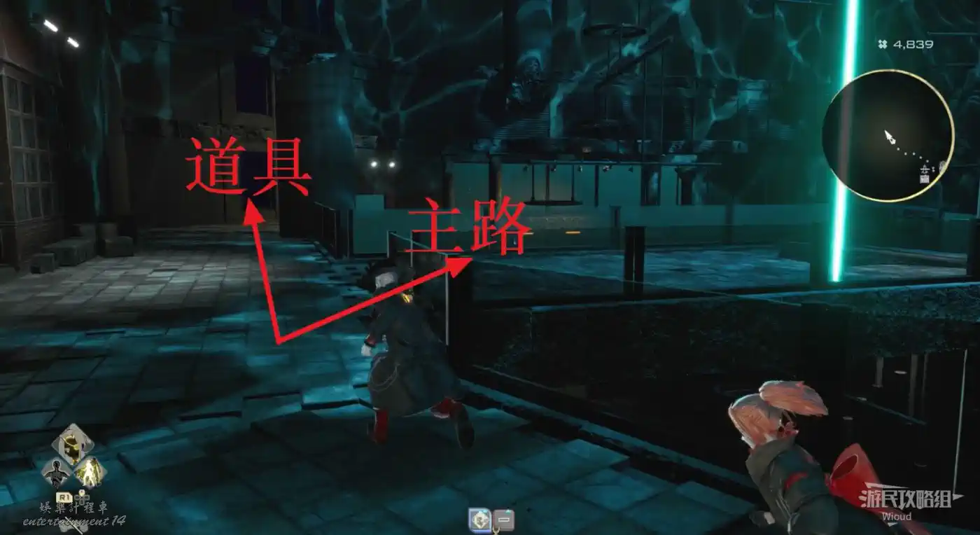 啟動復活點,穿過一片廢墟,看到頂部天花板有個紫色道具時,右側街道沿著上坡到天花板直接拿。