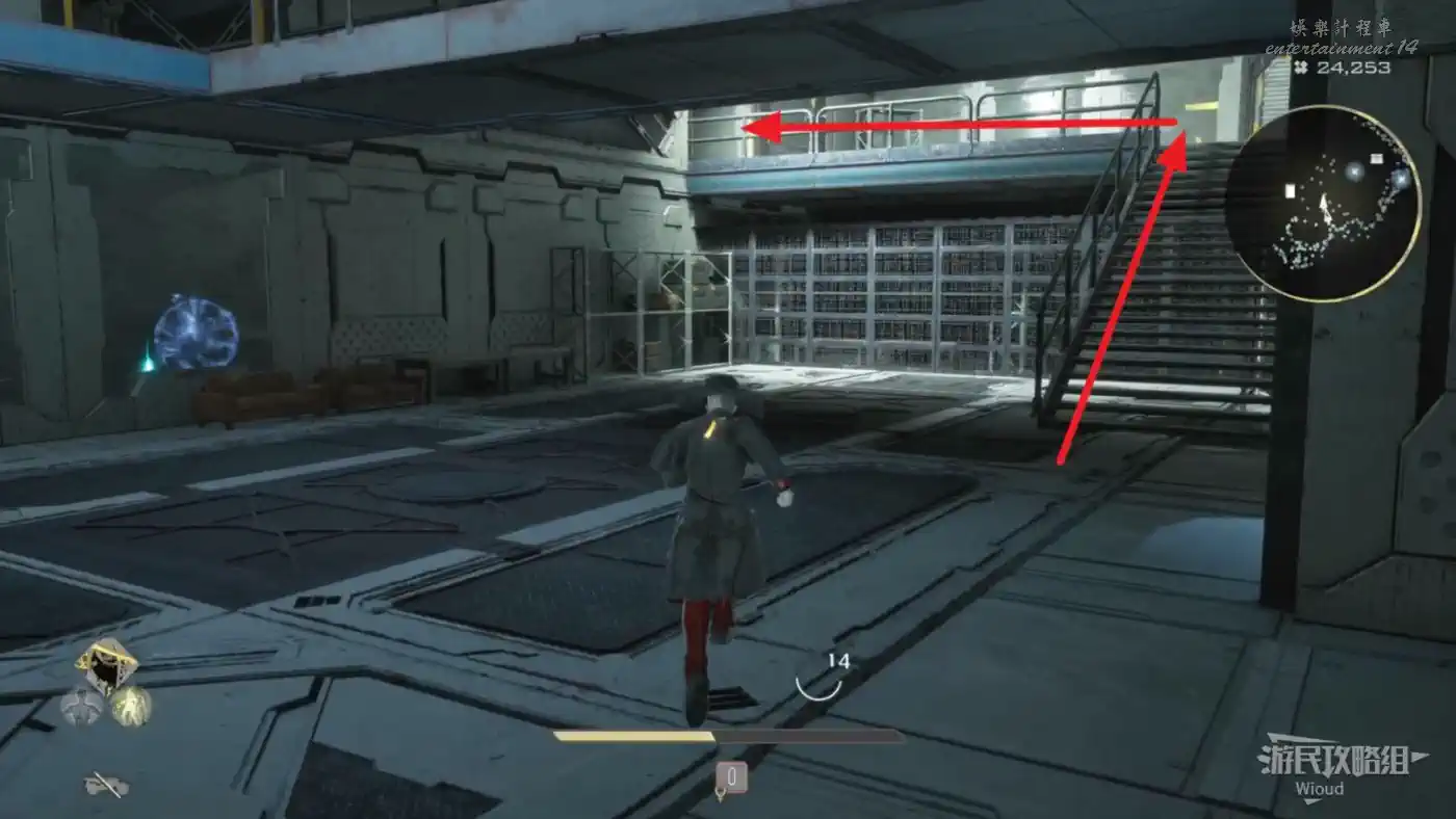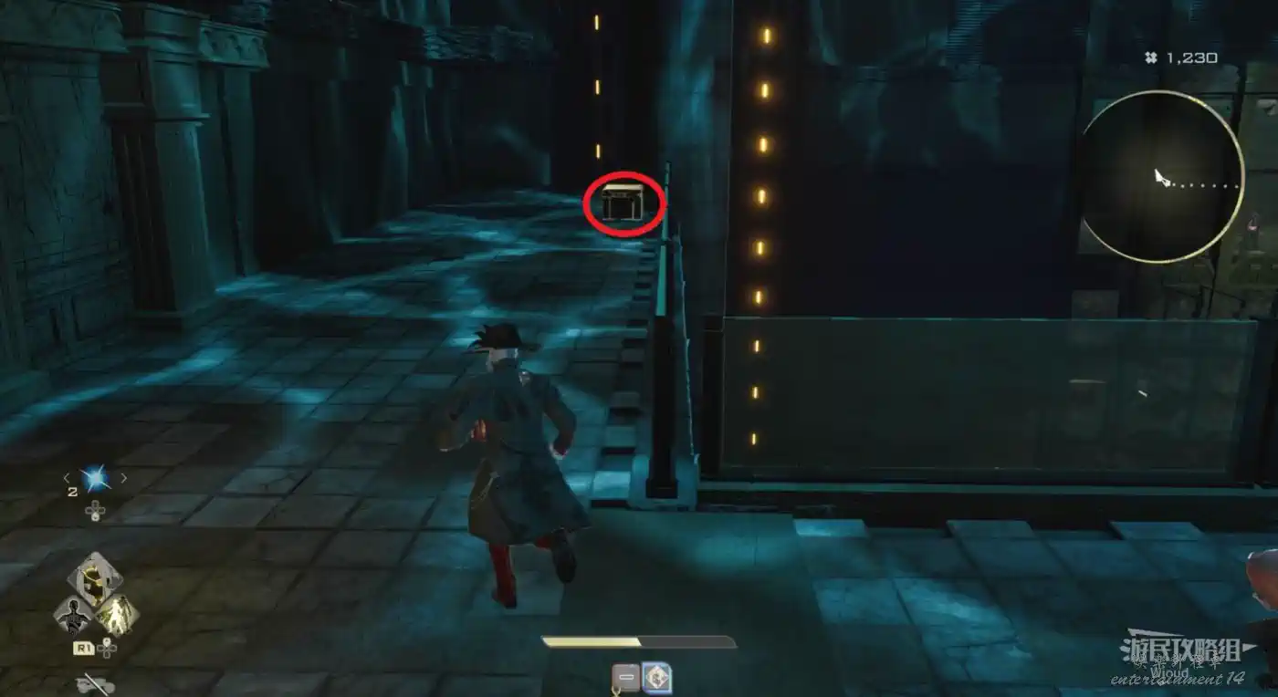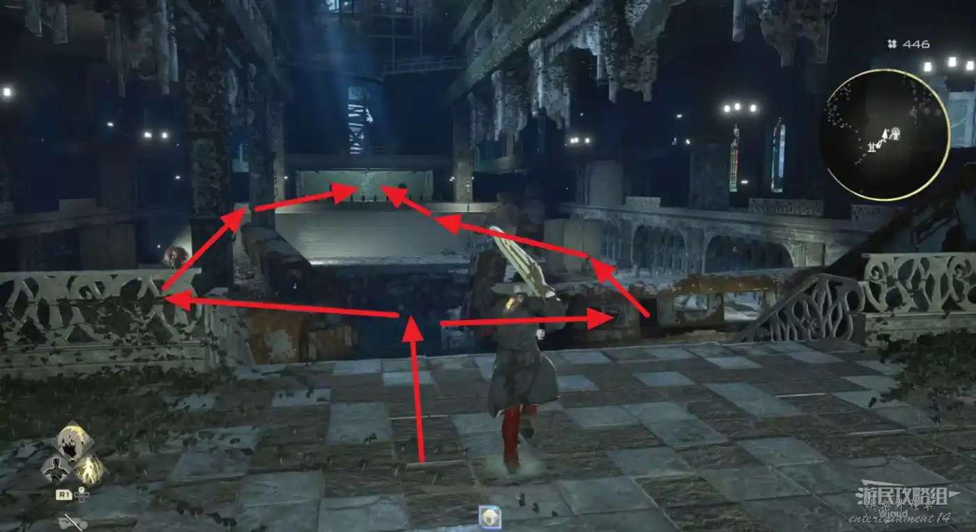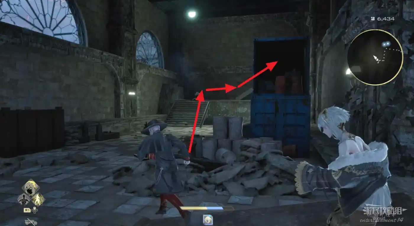 右側有個可以爬的斜坡斷柱,截面處右側跳過去可拿道具,左側可以連跳到一個塔台一樣的房間,有道具。