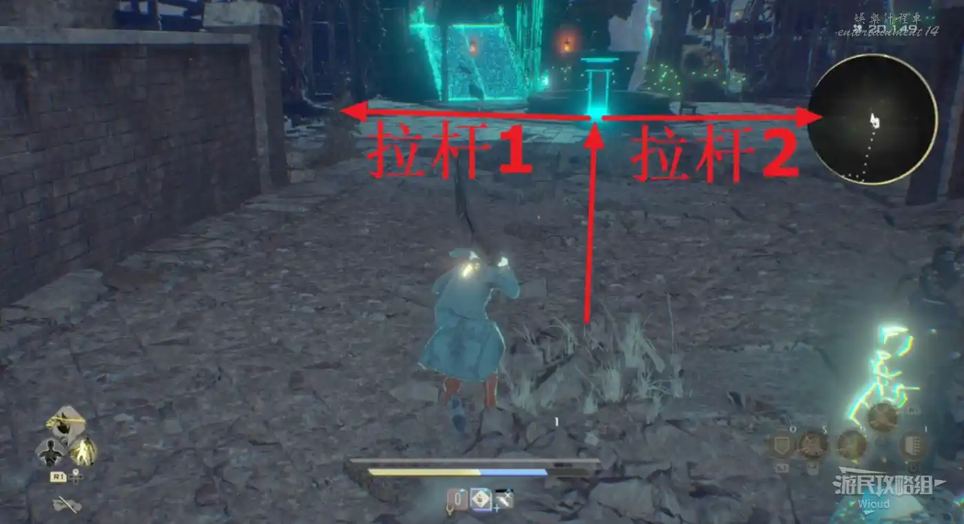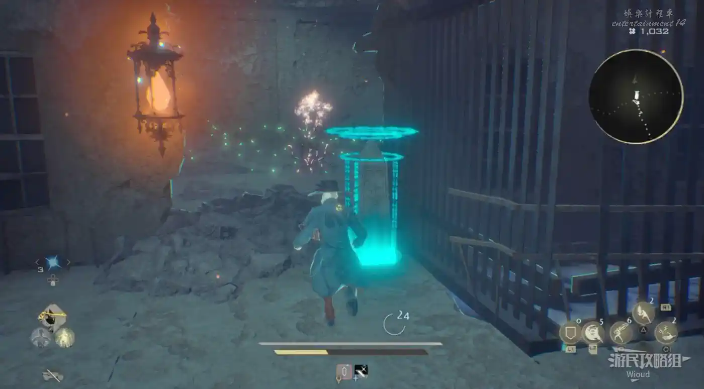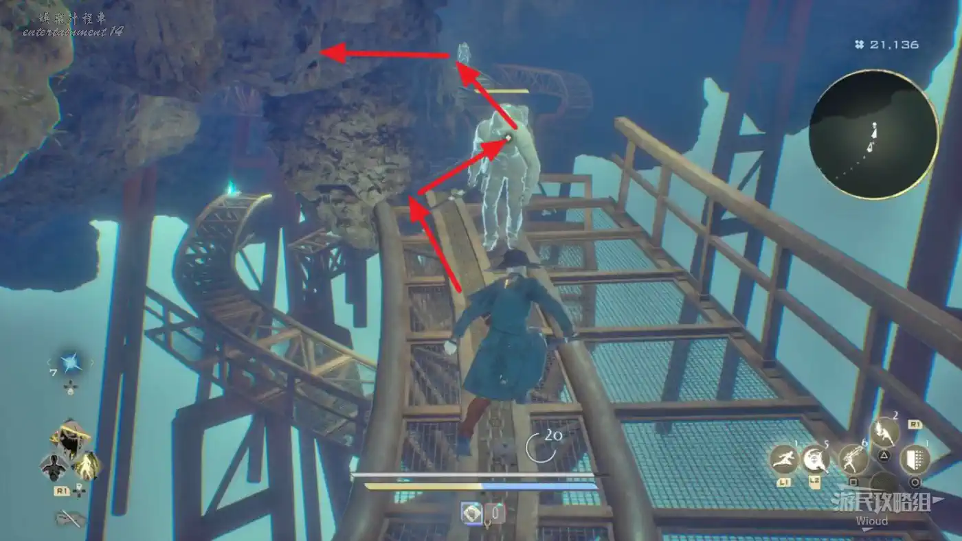 右側有個可以爬的斜坡斷柱,截面處右側跳過去可拿道具,左側可以連跳到一個塔台一樣的房間,有道具。