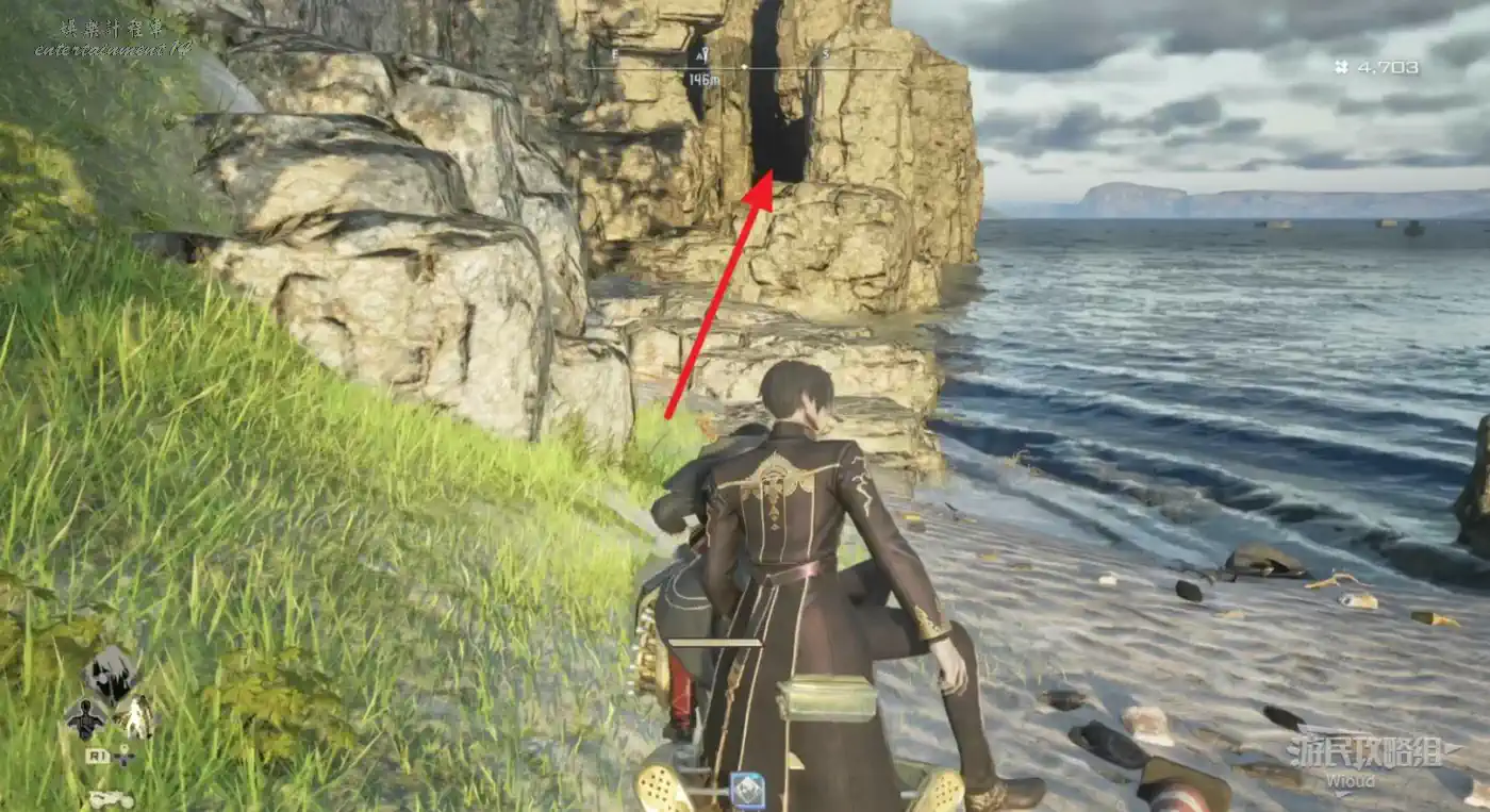 沿著懸崖處走一圈找到一個向下的樓梯走到海灘處即可看到入口。