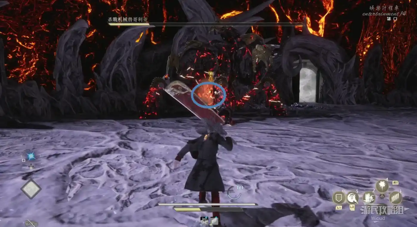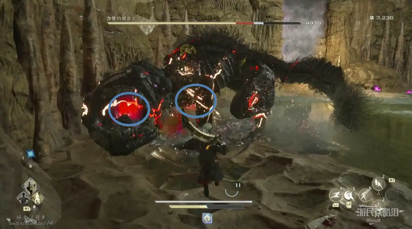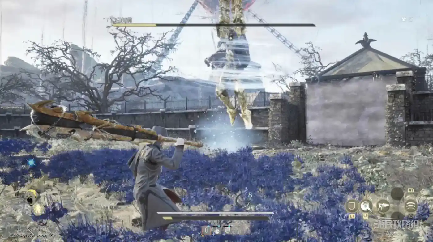 它最致命的攻擊是用武器進行大範圍多次的迴旋攻擊,需要玩家抓住前搖及時往後翻滾拉開距離。