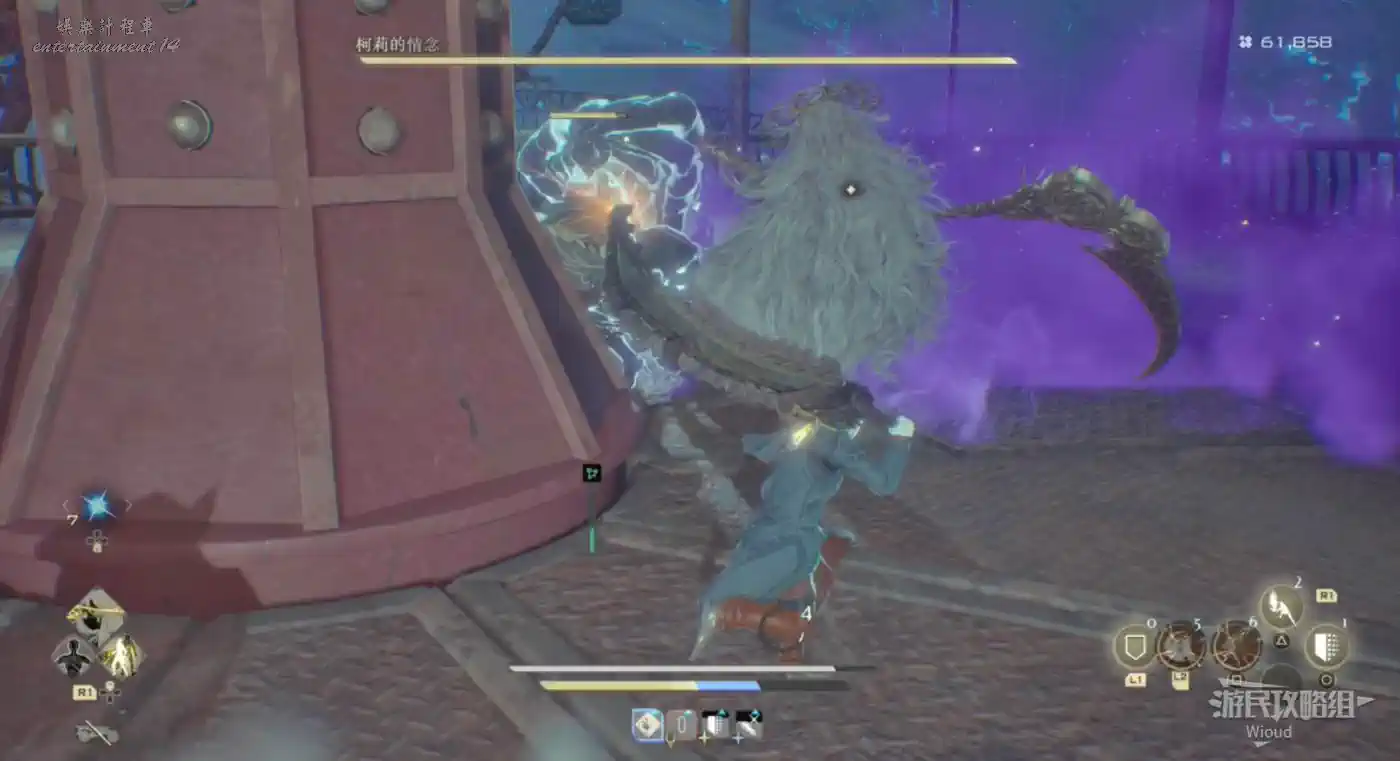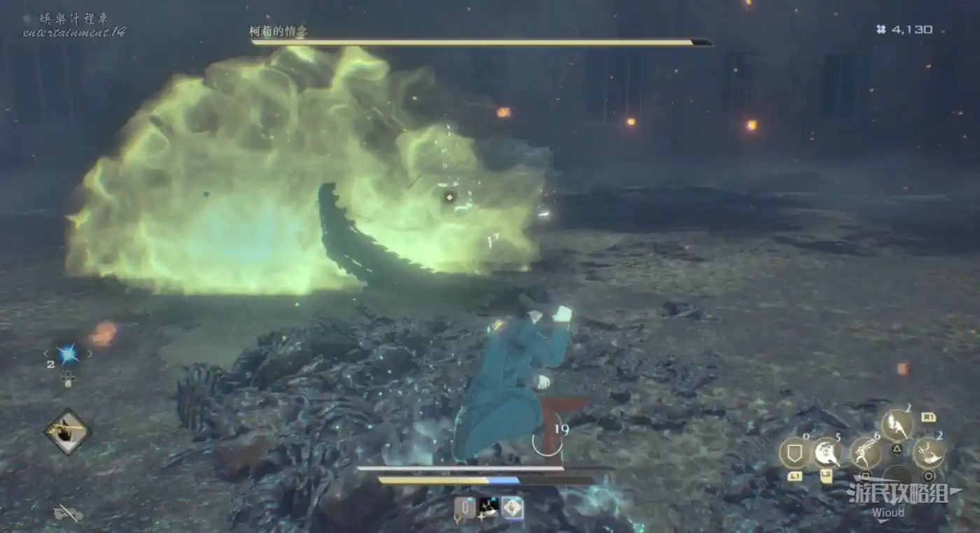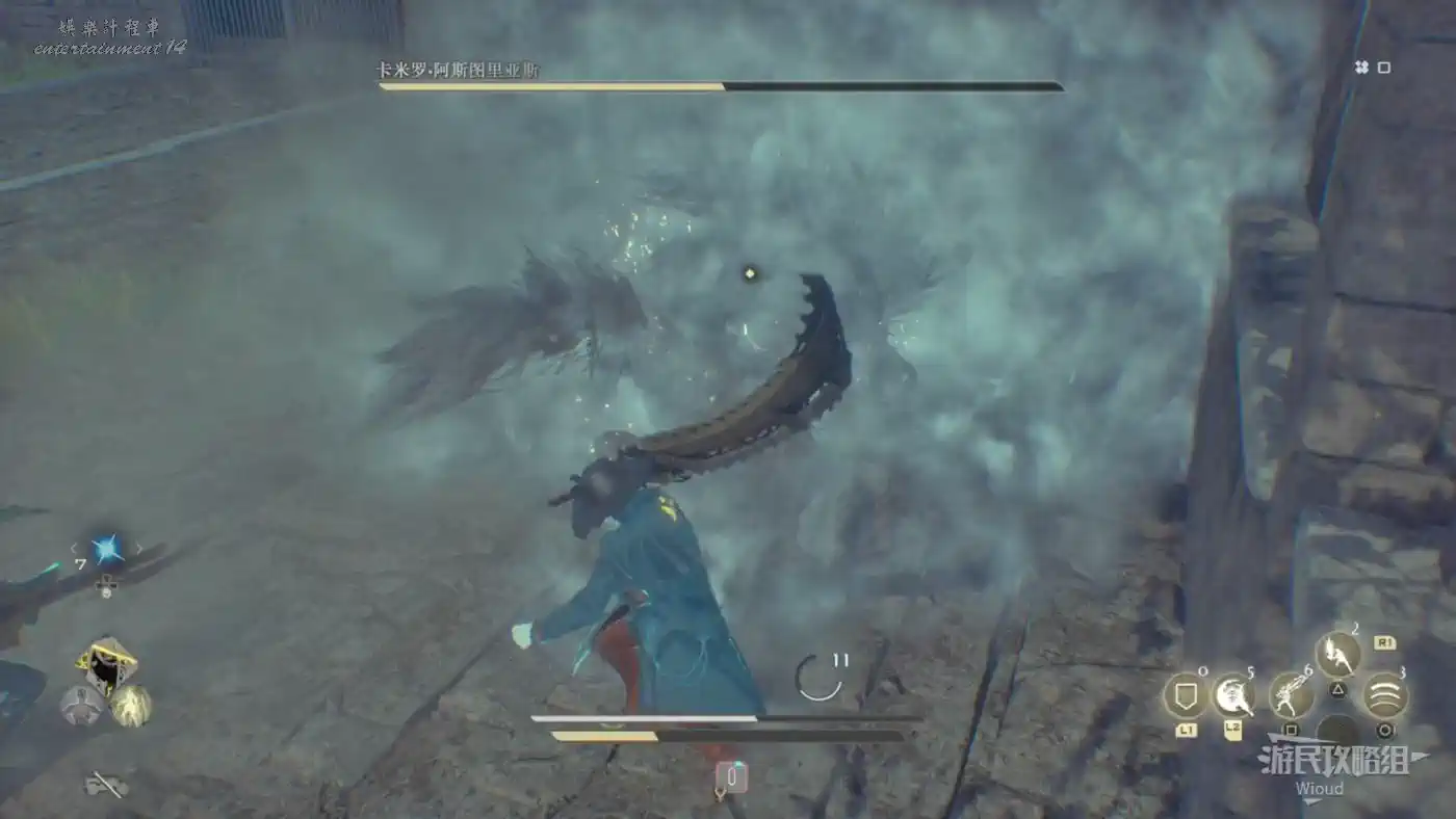 它最致命的攻擊是用武器進行大範圍多次的迴旋攻擊,需要玩家抓住前搖及時往後翻滾拉開距離。