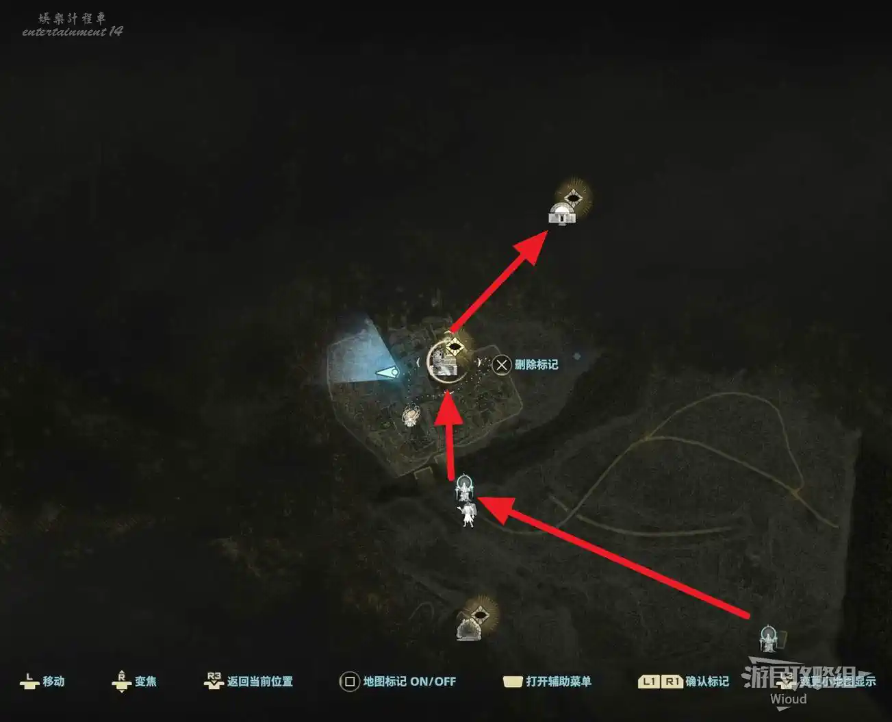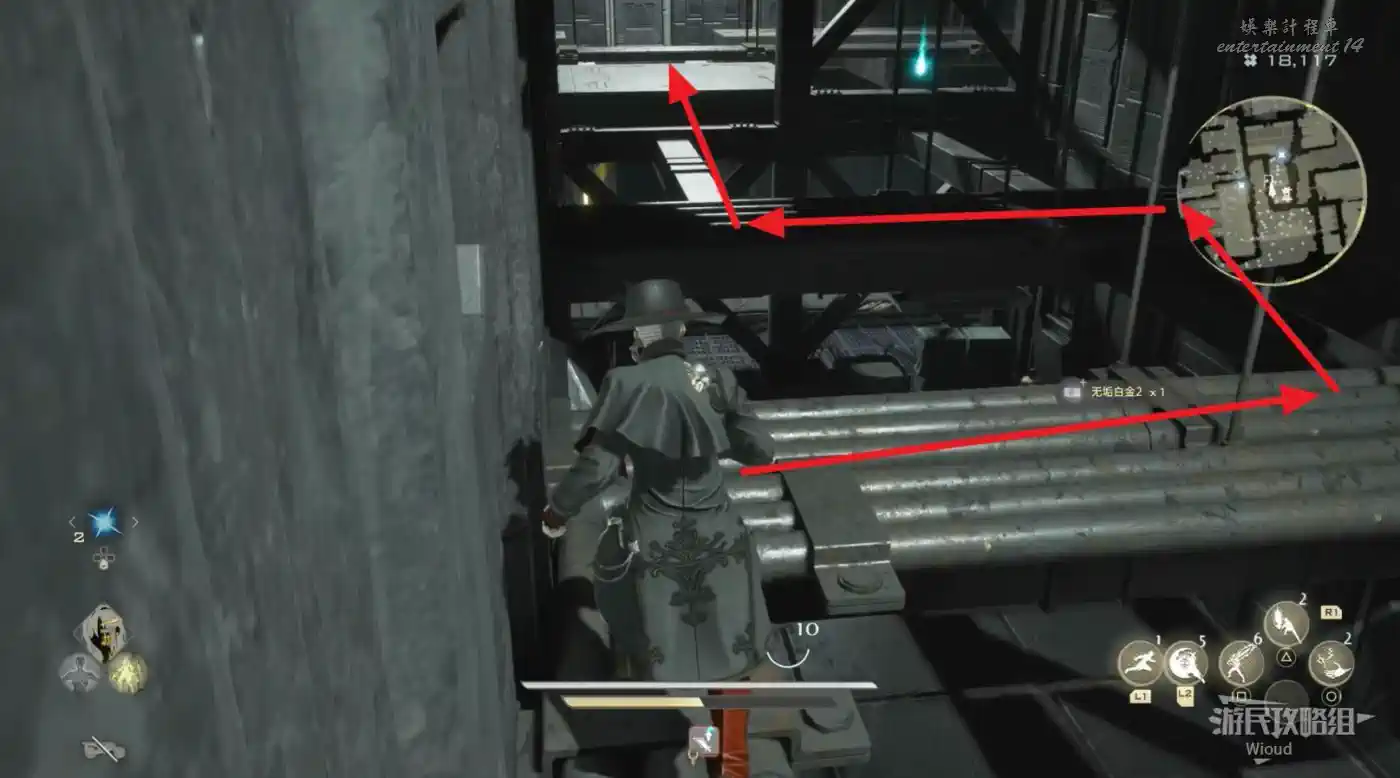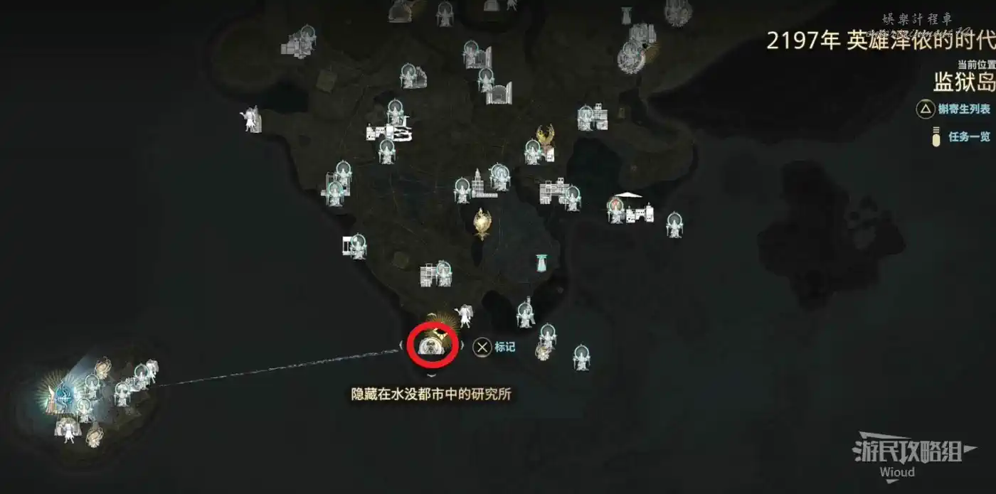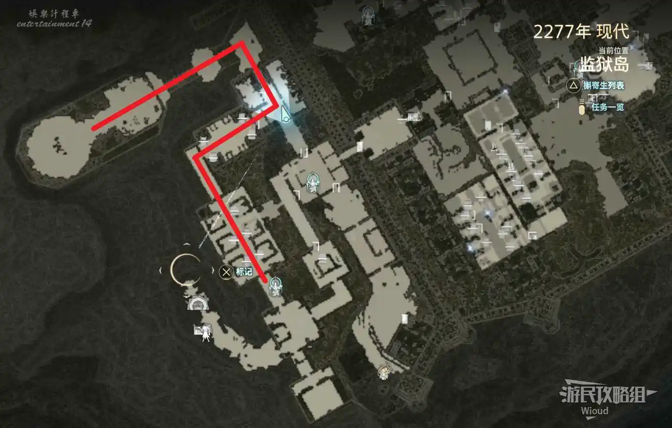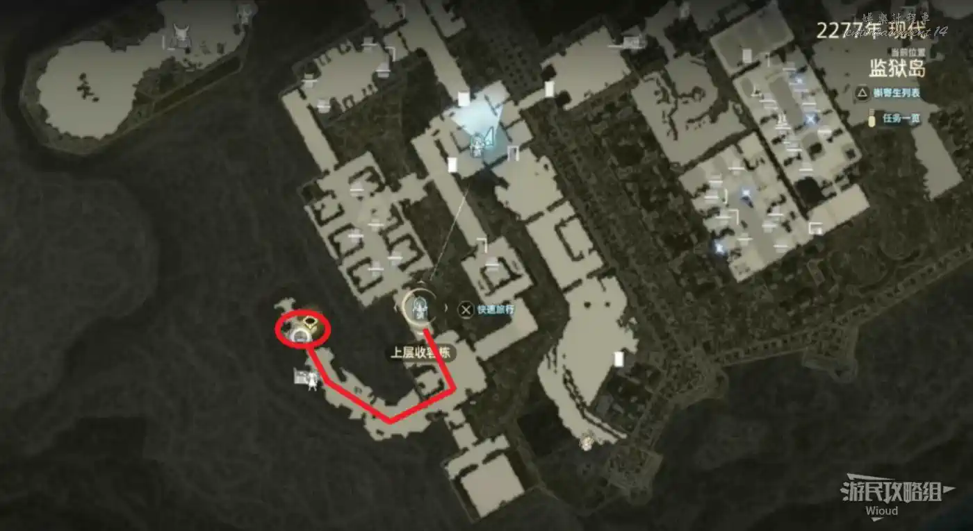 傳送到“監獄島”的篝火“上層收容棟”,沿著紅色路線移動到目標位置。