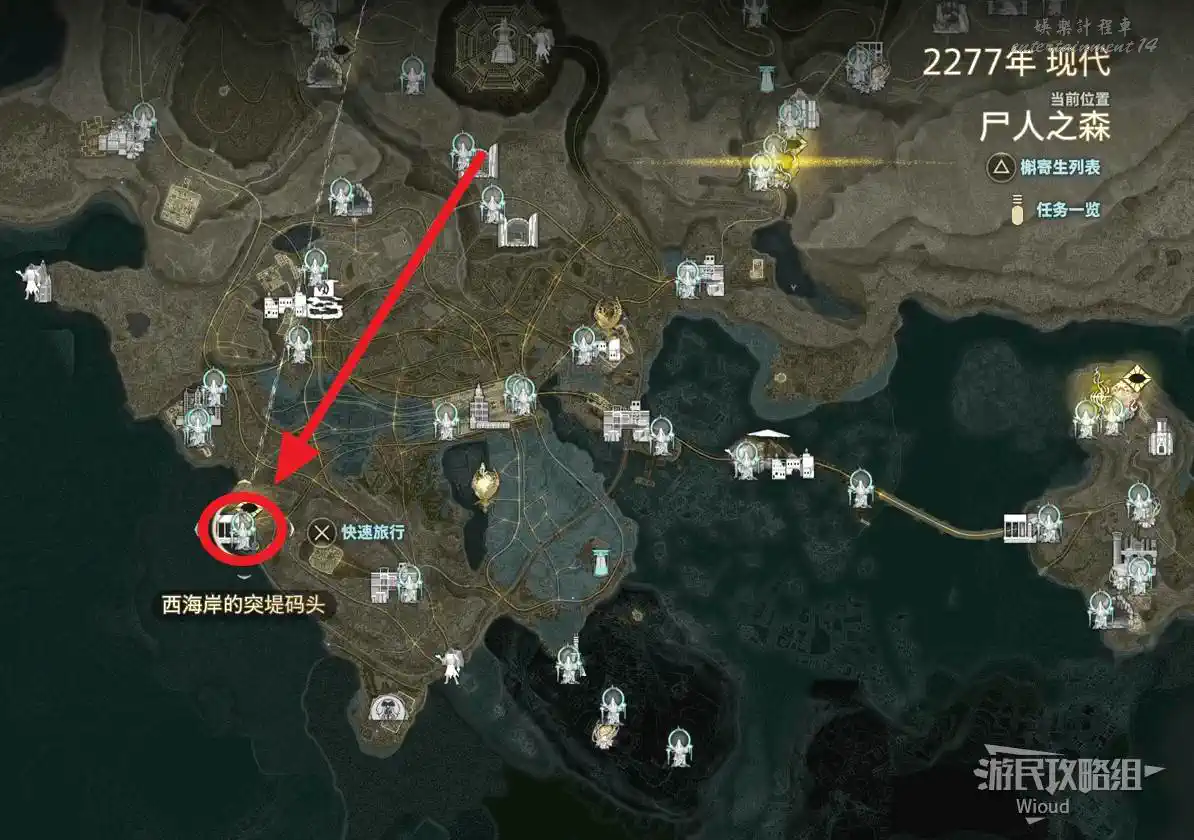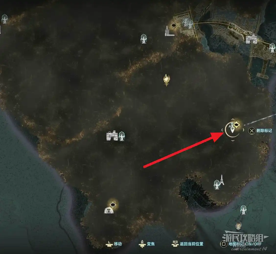 移動到地圖左側“汙水處理廠”,先放置指引然後走到岸邊。