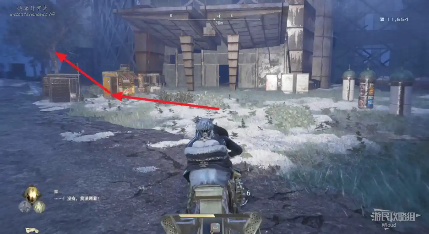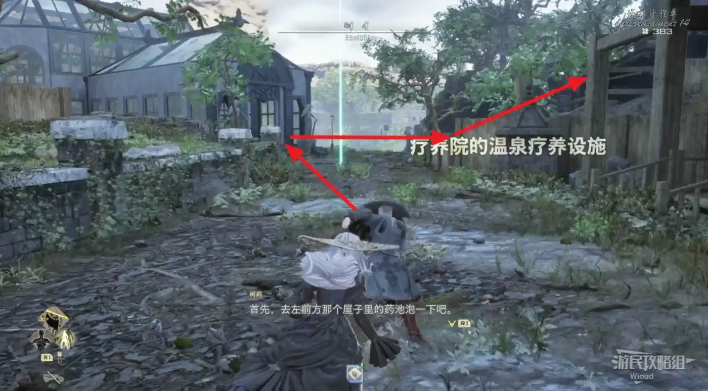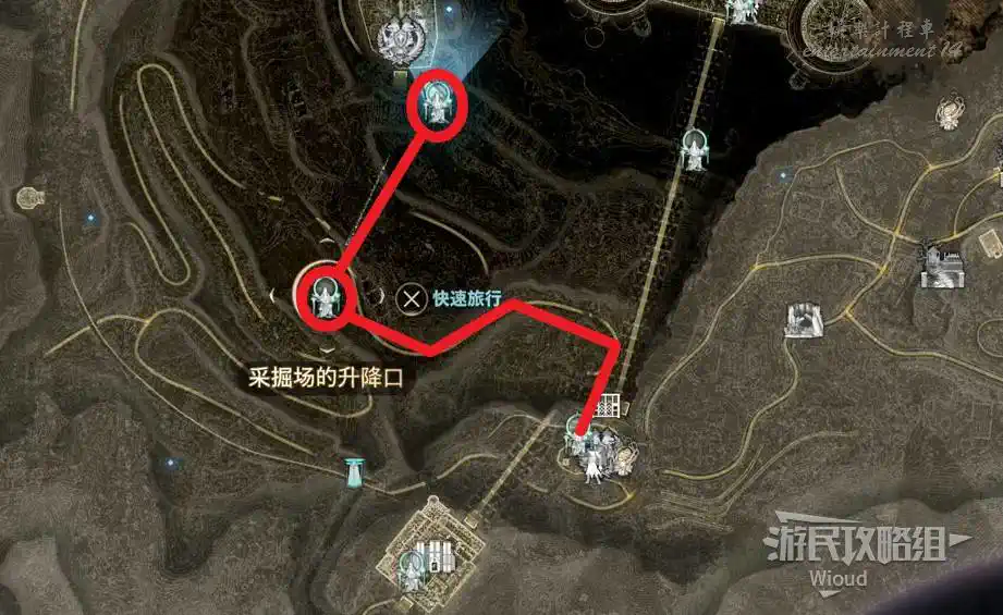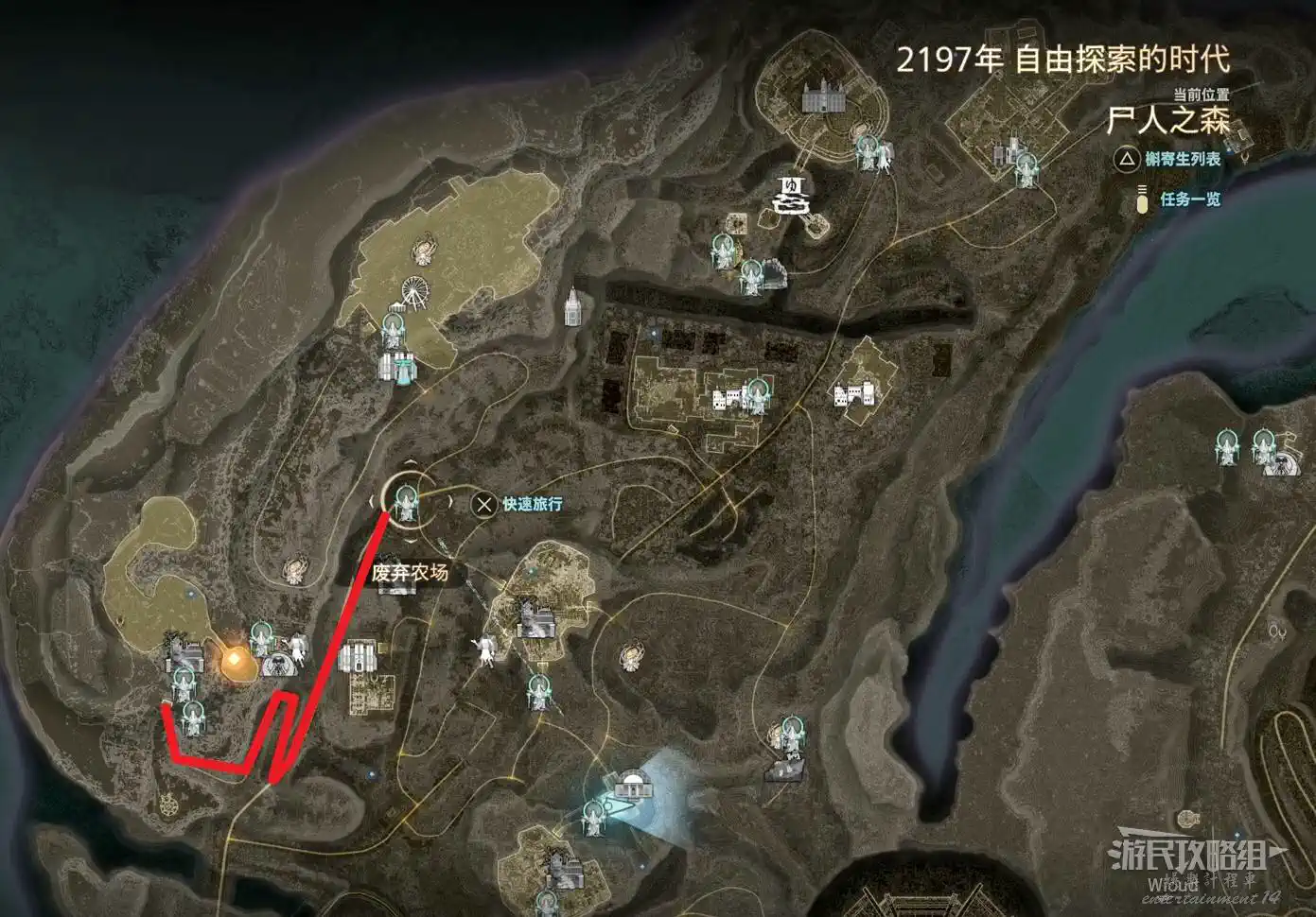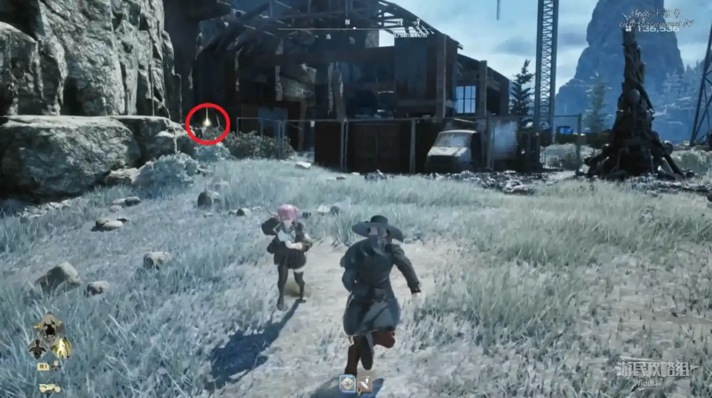 傳送到“廢棄農場”,沿著下圖紅色路線移動到左側的“半山腰上的隱秘村落”。