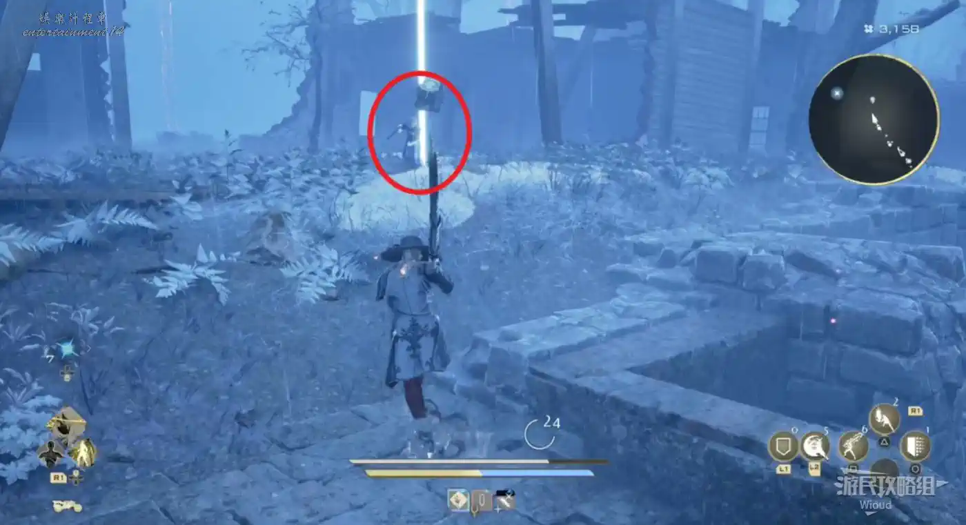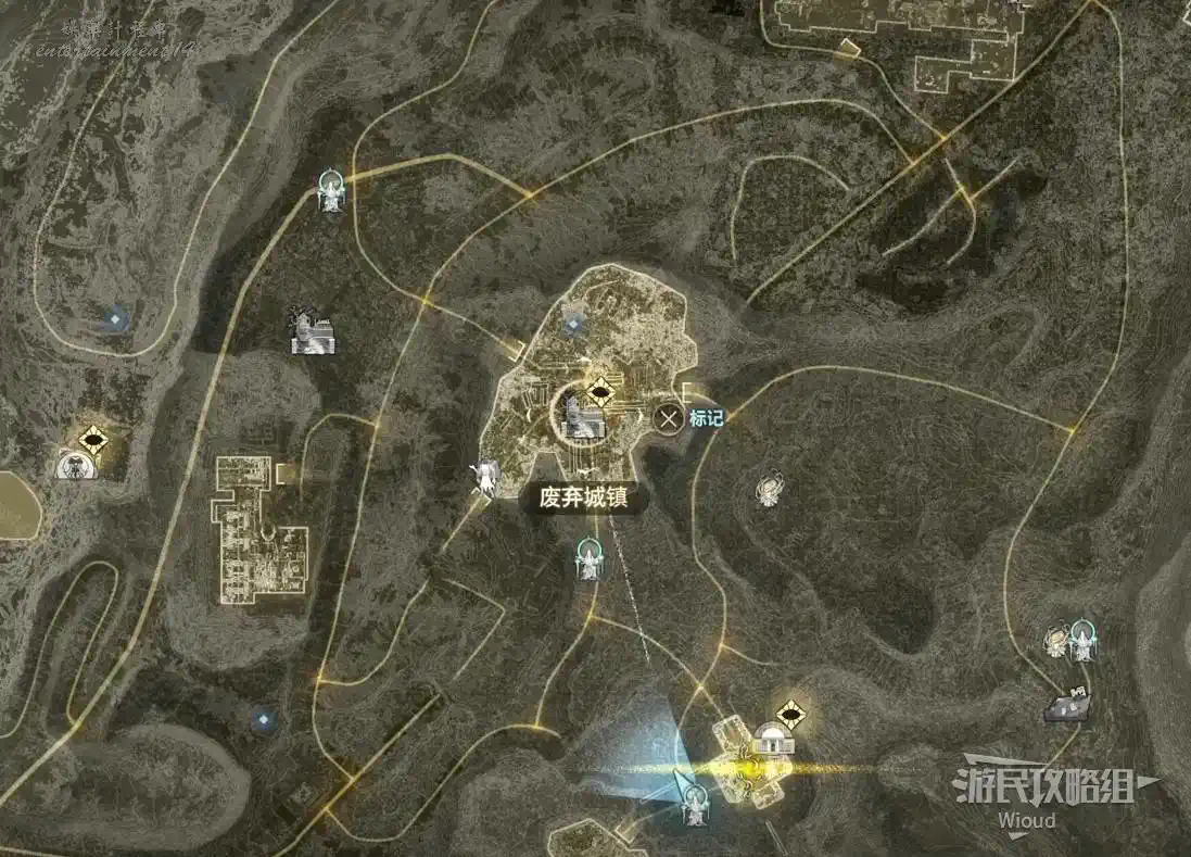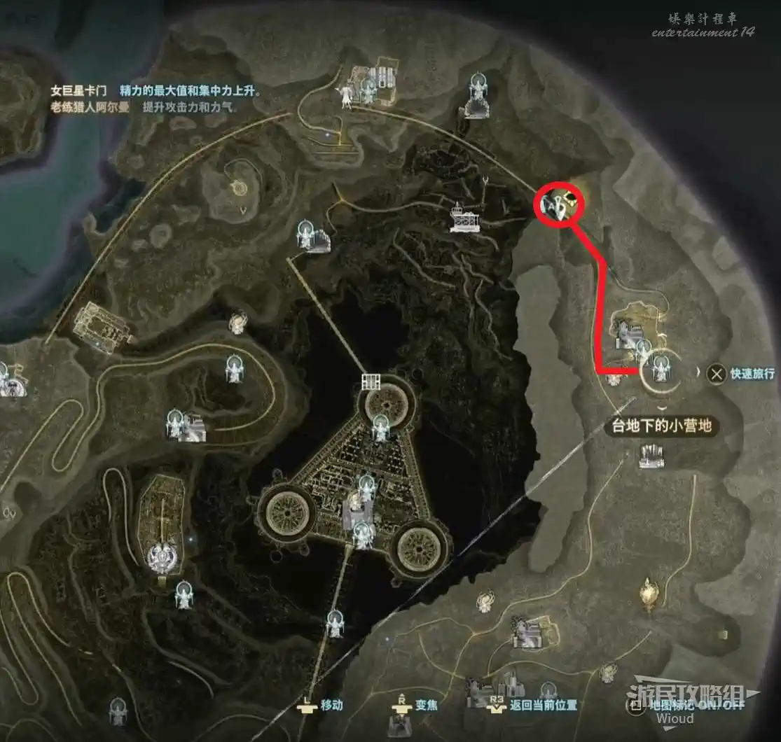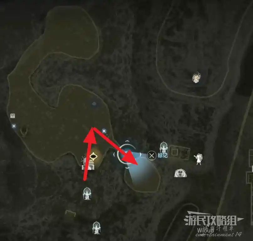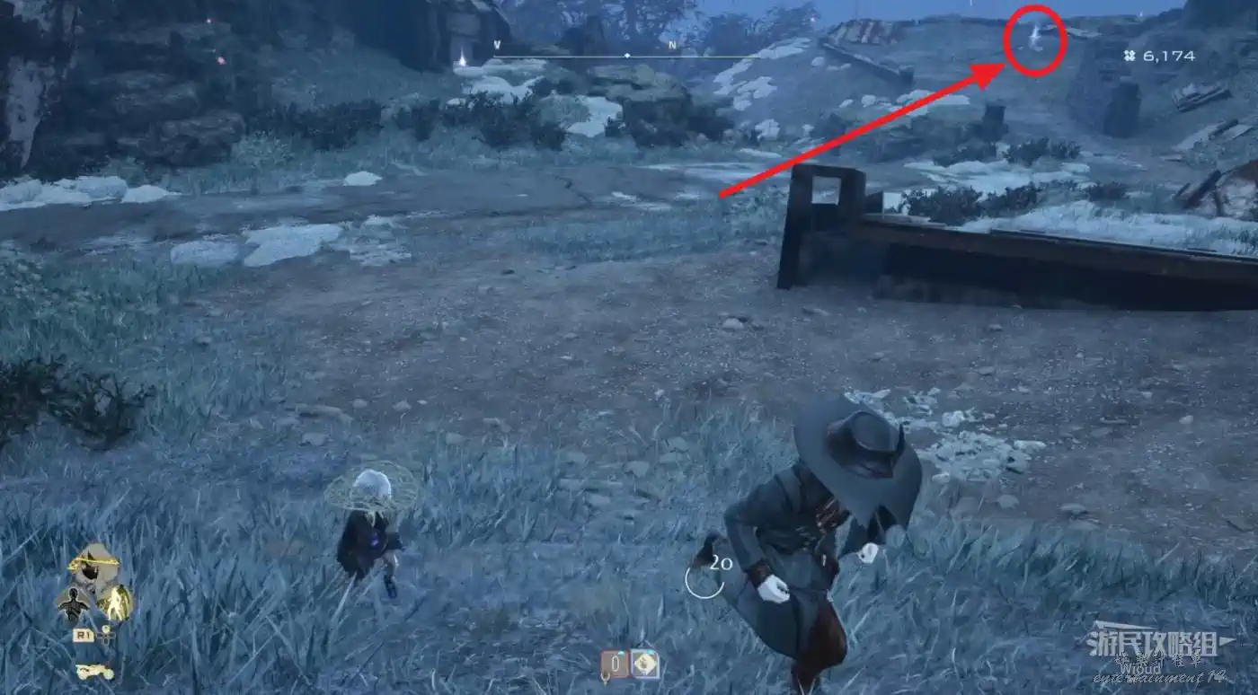 傳送到“廢棄農場”,沿著下圖紅色路線移動到左側的“半山腰上的隱秘村落”。